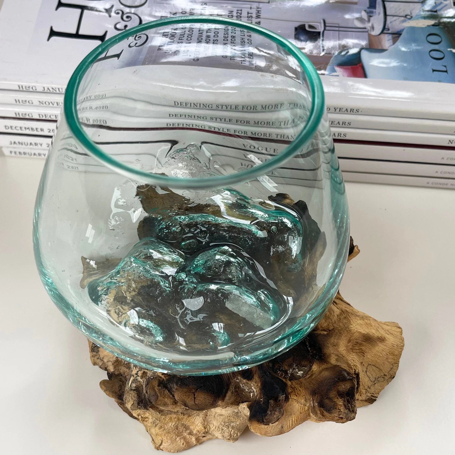 | Material | Teak Root Wood, Molten Glass |