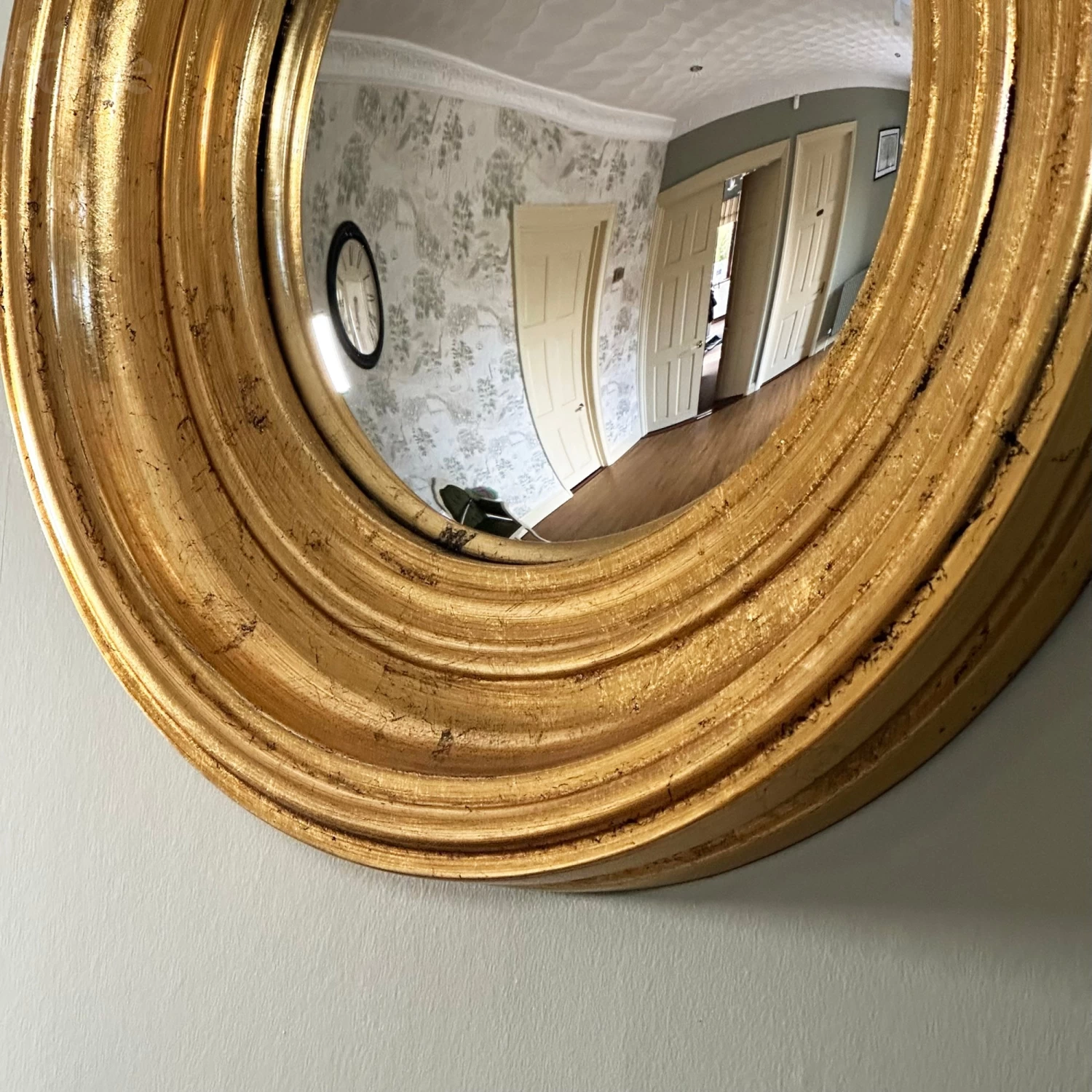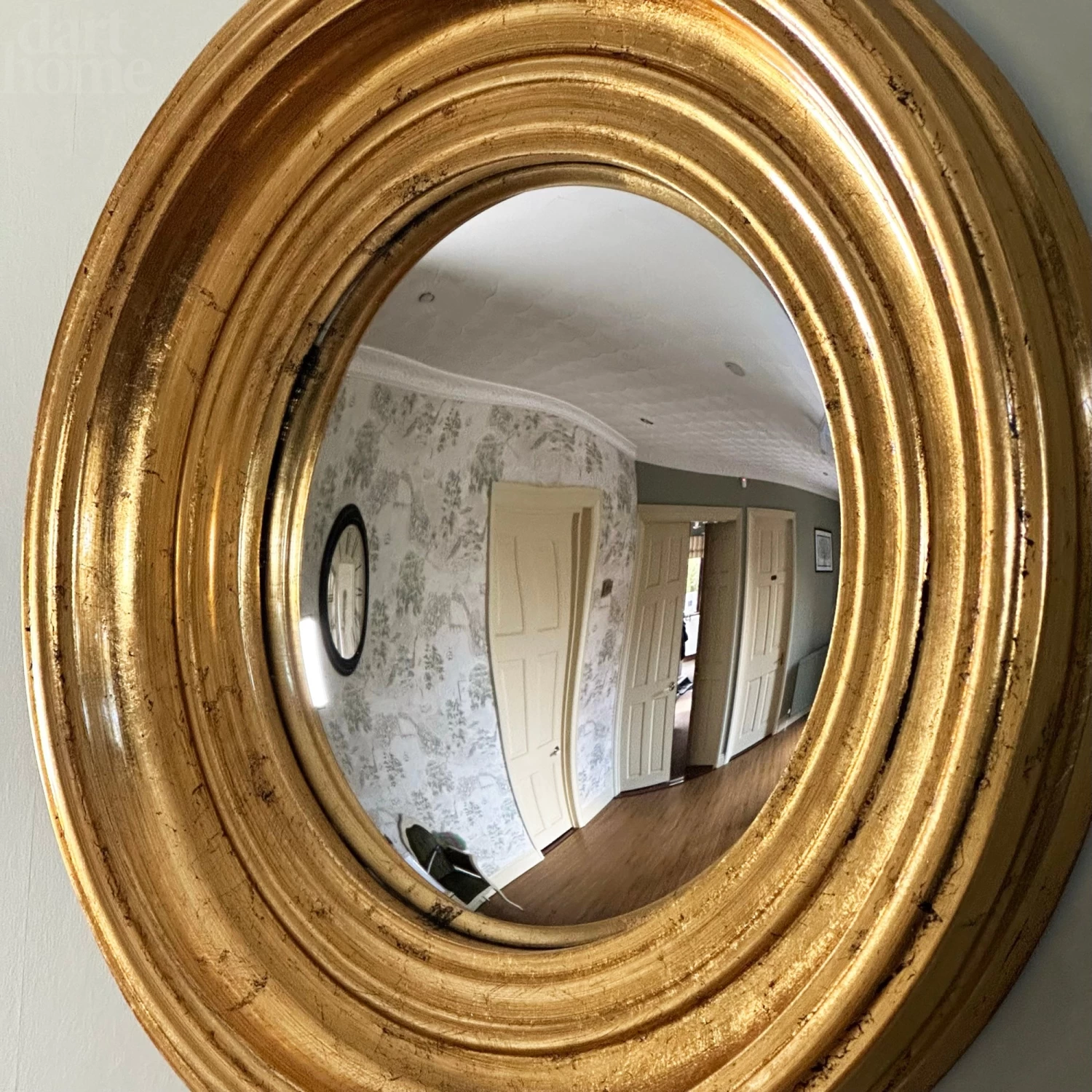 This beautiful antique gold convex mirror boasts a round design and 10cm round interior mirror which be a focal point of any bathroom. It is wall mounted and lightweight making it a perfect item for the living room.