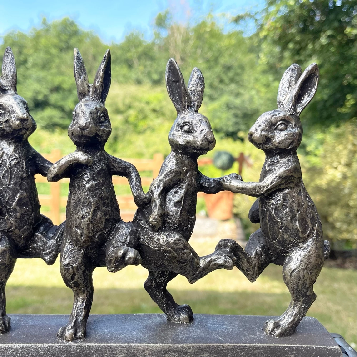 This Hare ornament need’s a happy home and we think you’ll be the perfect owner! In a charming antique gold finish that will suit all exterior or interior, these five dancing hares on a rectangle base are the perfect addition for your home or garden..