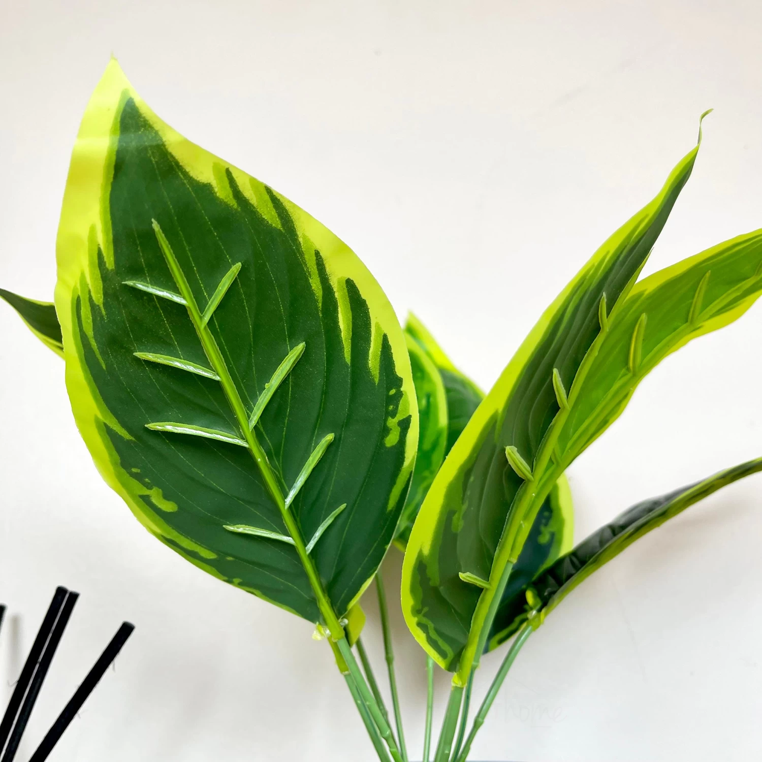 A Gorgeous eye-catching Artificial Dieffenbachia sat in a blue ceramic pot with a floral pattern, boasting a highly realistic, real touch design. Perfect decorative artificial plant to fill an empty shelf, sideboard or bedside table.