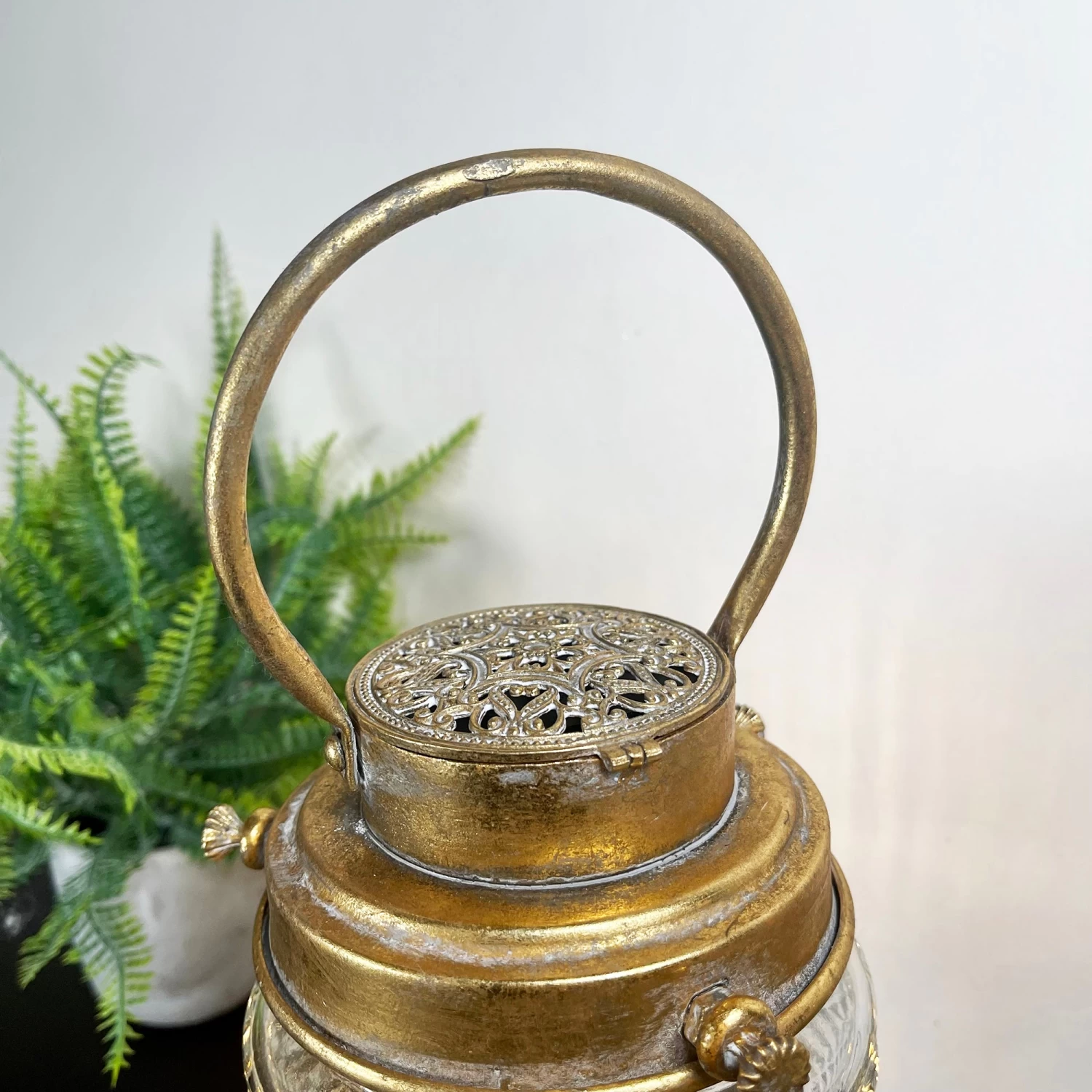 Offering a convenient energy saving lighting solution, with this stylish distressed gold LED light with jewelled glass for decoration and an ornate metal pattern on top to cover the battery pack. Use this industrial LED lantern on your desk or table for a soft warm white that saves turning the big light on. 2x AA batteries required (not supplied).