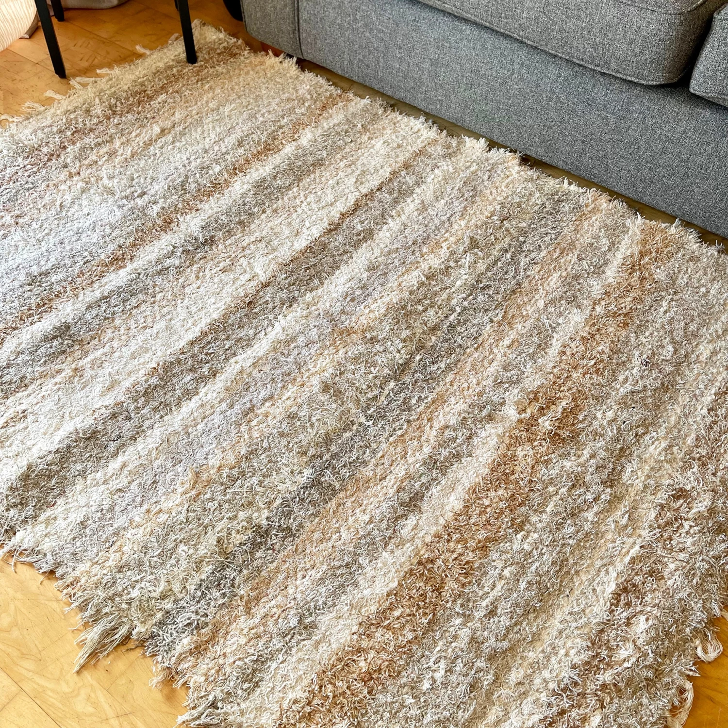 This 120x170cm shaggy area rug will fill your living room floor with neutral colour and traditional style. Made from recycled cotton, this floor rug offers a warm homely feel wherever it is placed. Its softness offers a relaxing feel underfoot. Filled with a variety of toned beige stripes, this floor decor is perfect for living rooms and bedrooms to fill an open space.