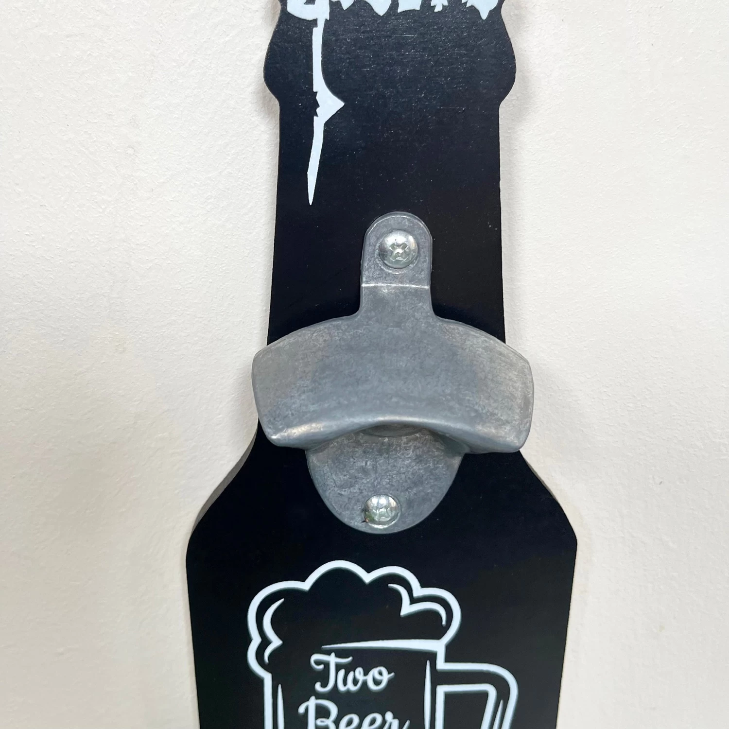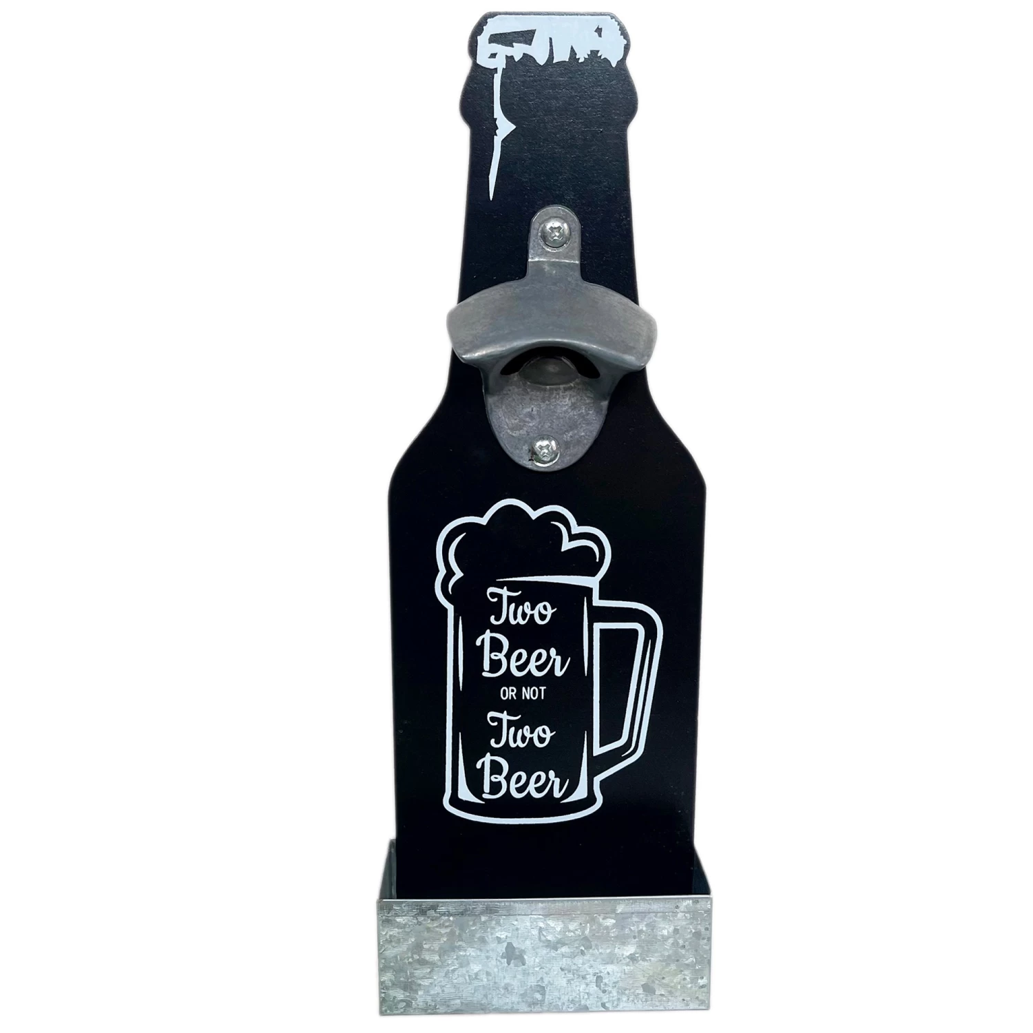 This novelty item allows you to open your beer and collect your tops too. Its a great tool for recycling. Text reads ‘Two Beer Or Not Two Beer’.