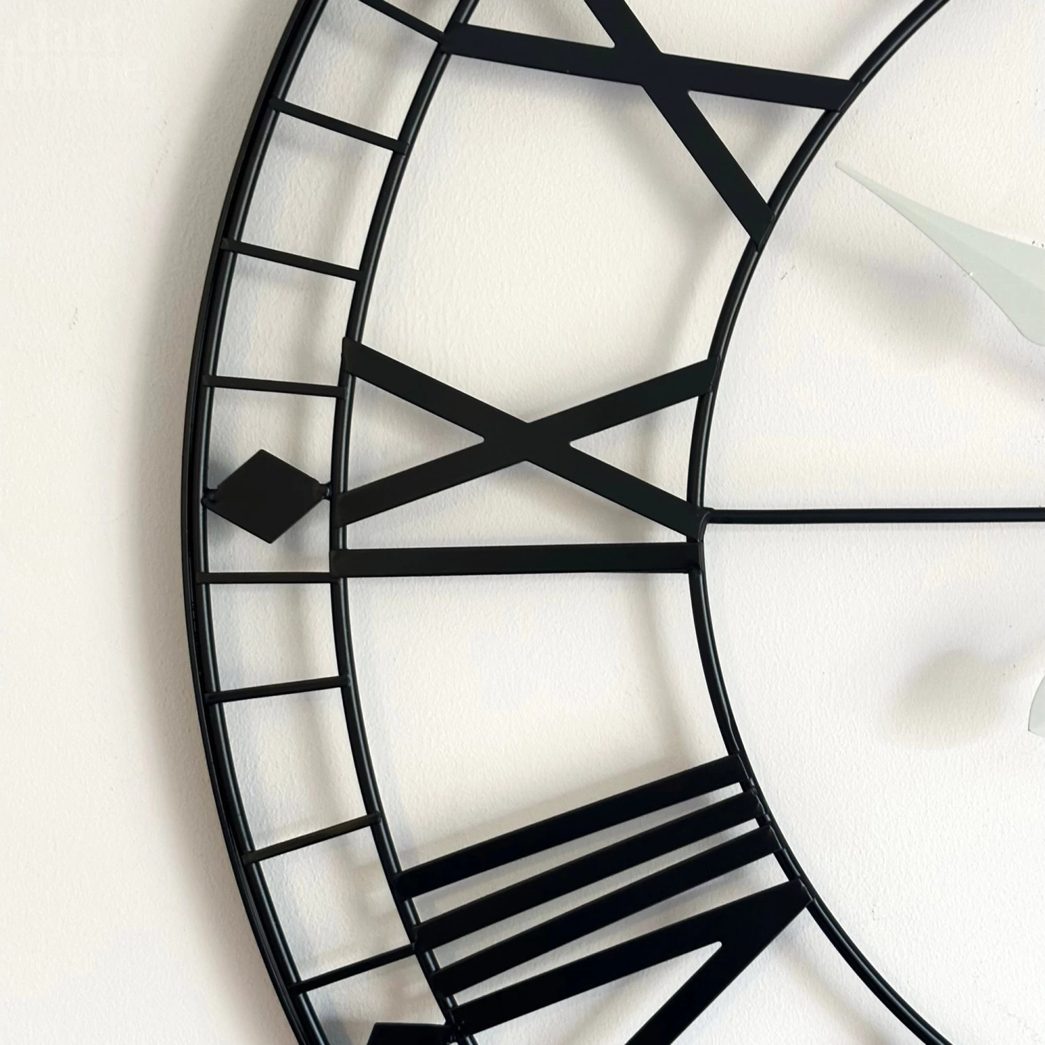 This 75cm skeleton clock with metallic grey hands is sure to be a centrepiece of your living room on whichever wall it is placed on. This piece features classic roman numeral 12 hour display with a thick black border. The round clock provides a practical, yet stylish timepiece that will only enhance your current home decor.