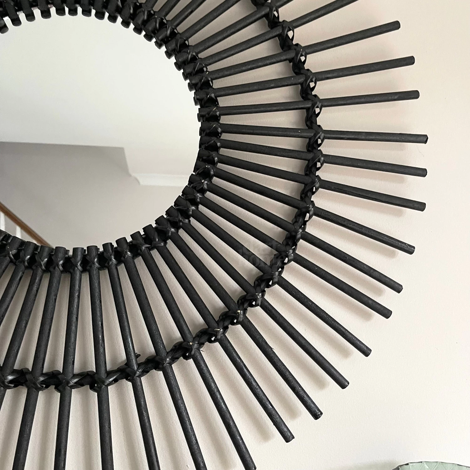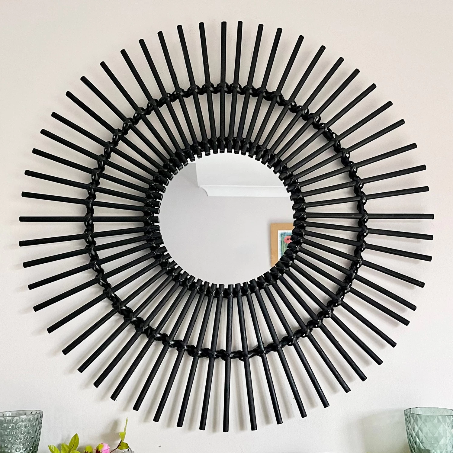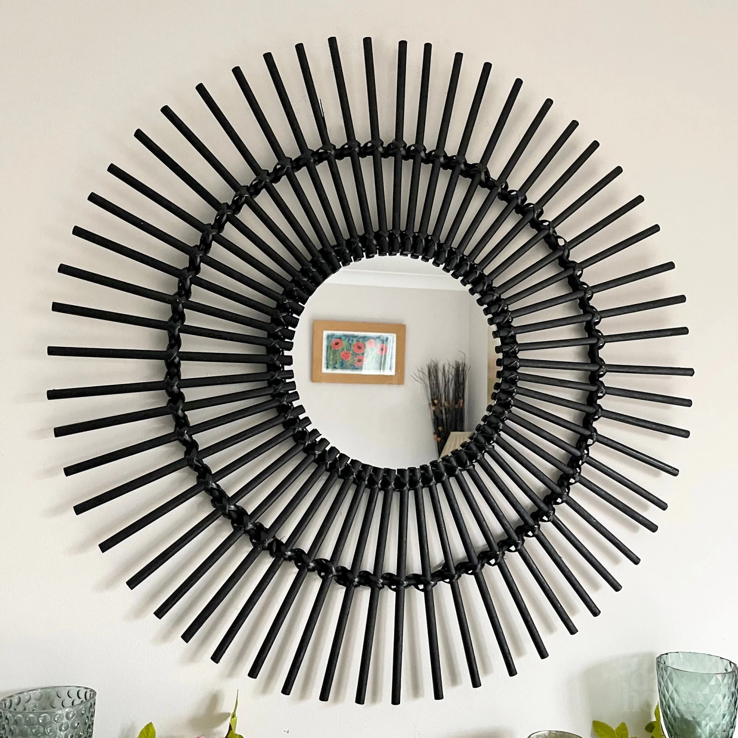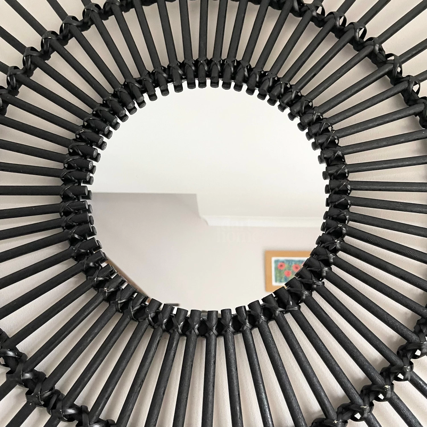 A beautifully hand crafted black wall mirror designed with wood and rattan to offer a mid-century modern style wherever hung. Features a large 80cm diameter frame with a 26cm round interior mirror. Perfect for hallway or fireplace display.
