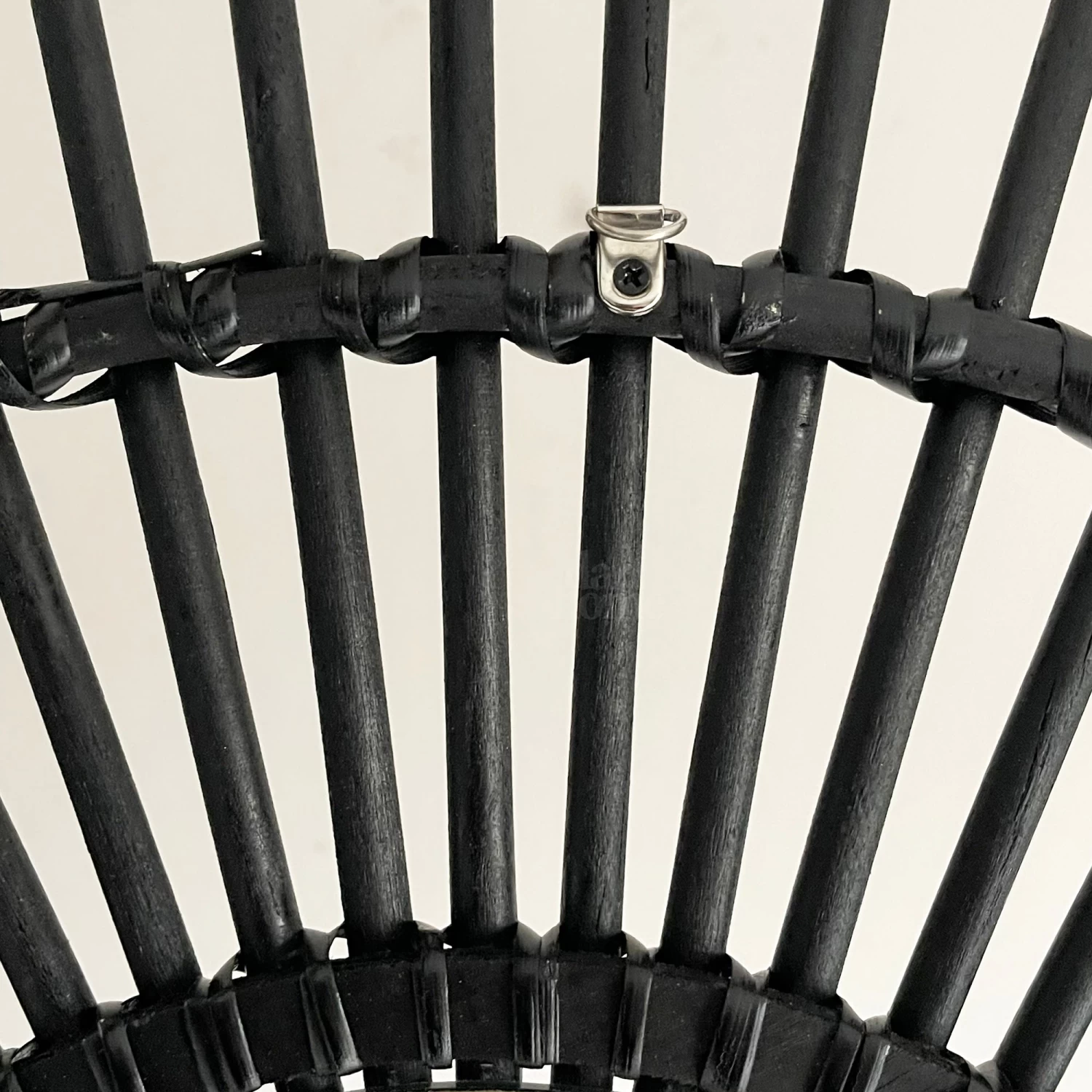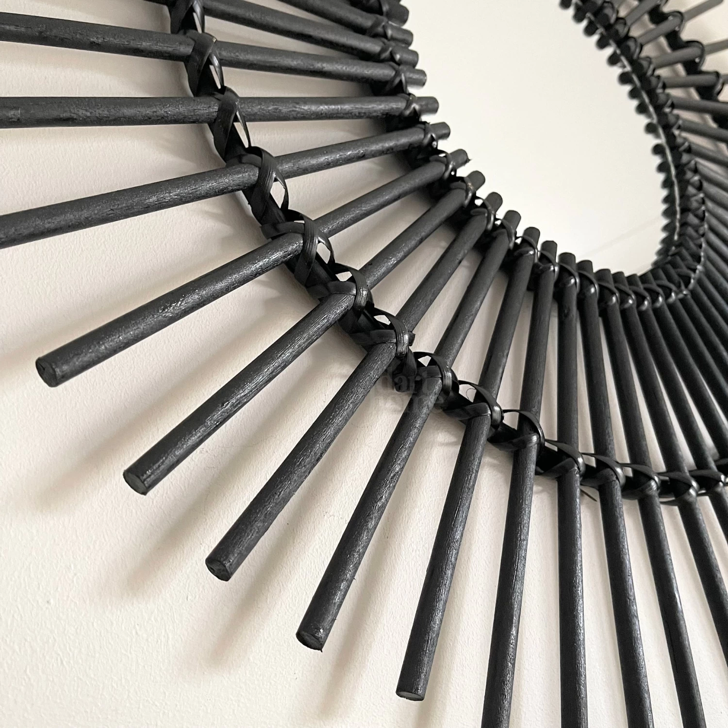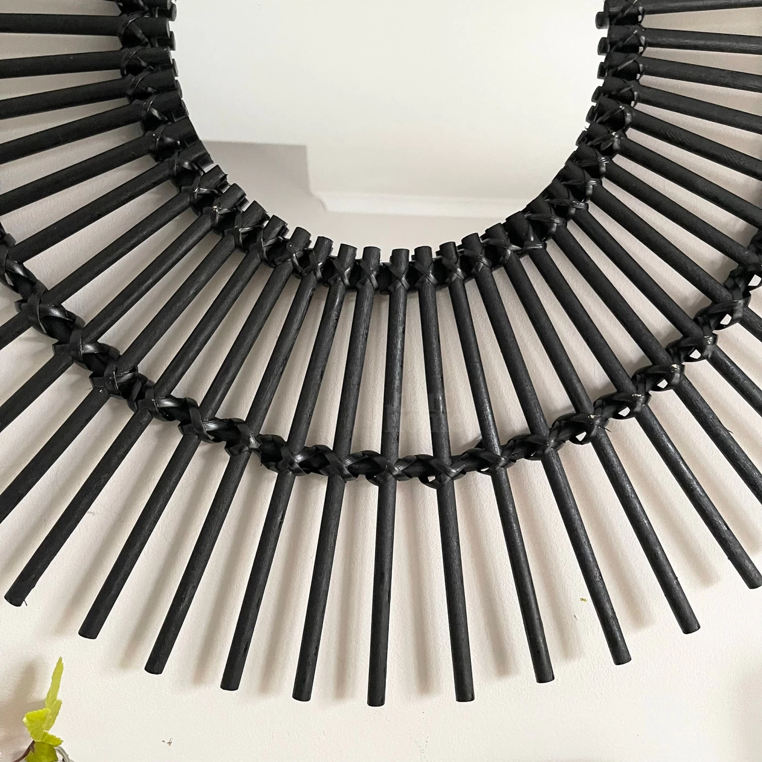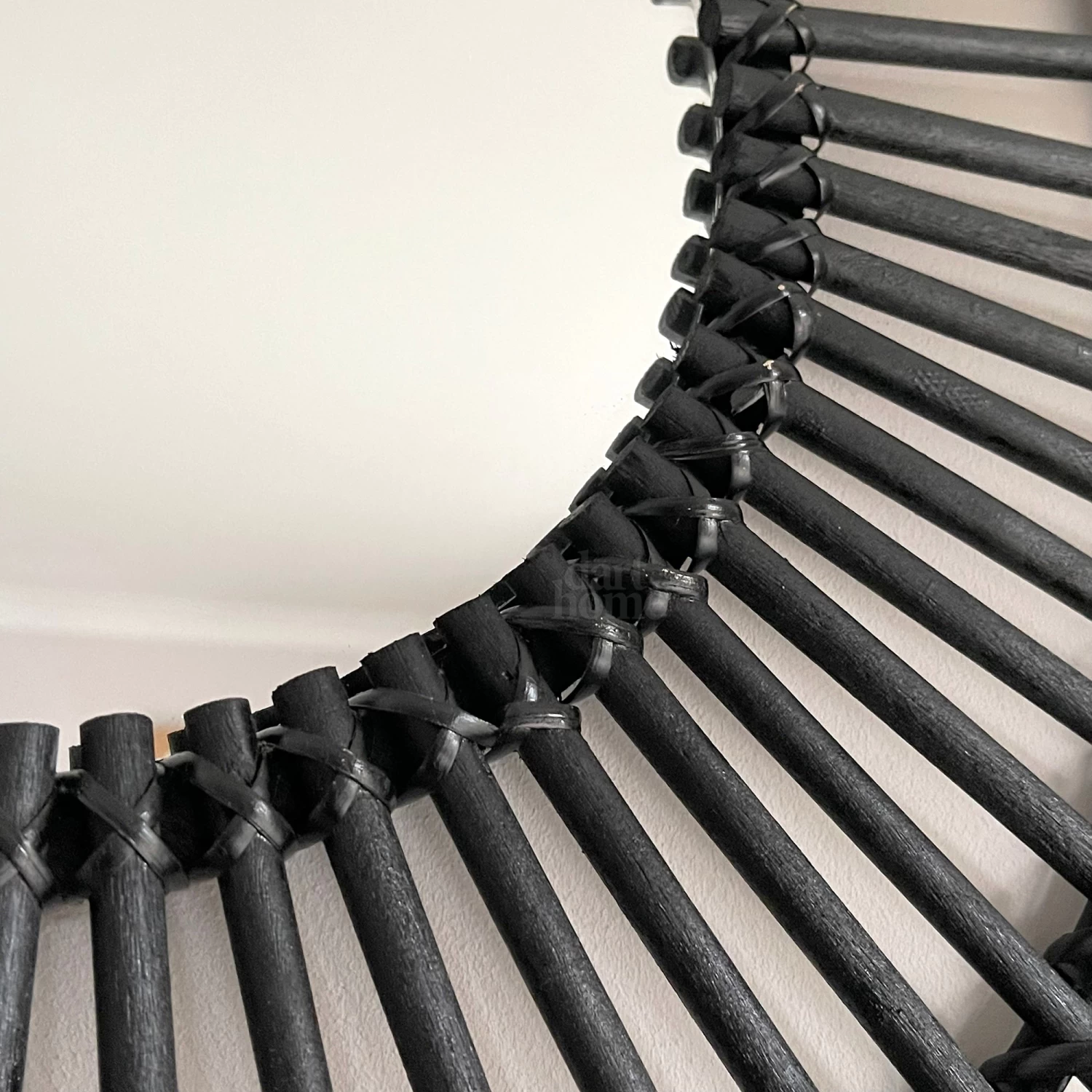 A beautifully hand crafted black wall mirror designed with wood and rattan to offer a mid-century modern style wherever hung. Features a large 80cm diameter frame with a 26cm round interior mirror. Perfect for hallway or fireplace display.
