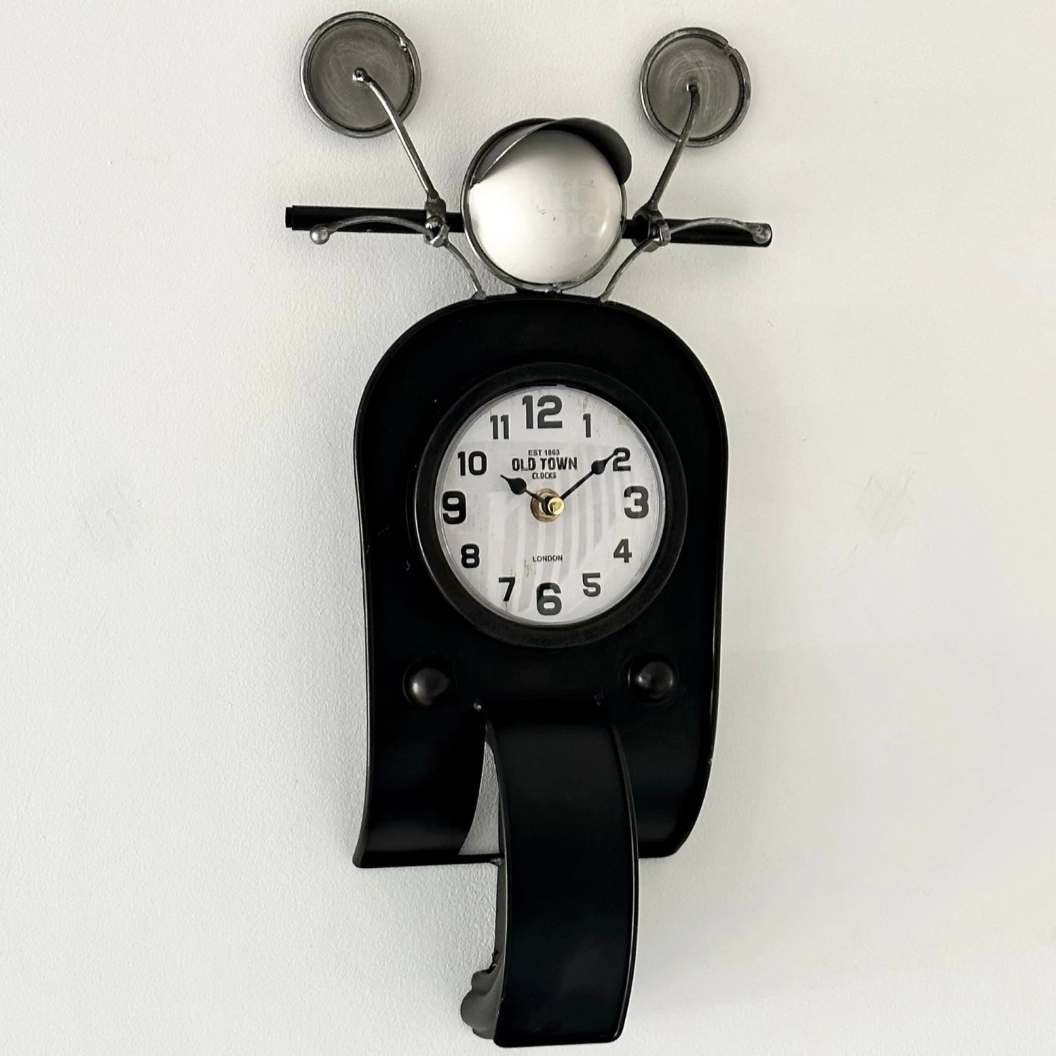 Discover the retro-style charm of our black Scooter wall clock: a metal novelty Vespa design, perfect to bring a cool energy to your home decoration. Battery-powered, it’s sure to be a hit with your guests, making a fun and unique gift to remember. Rev your engines and get ready to be wowed!