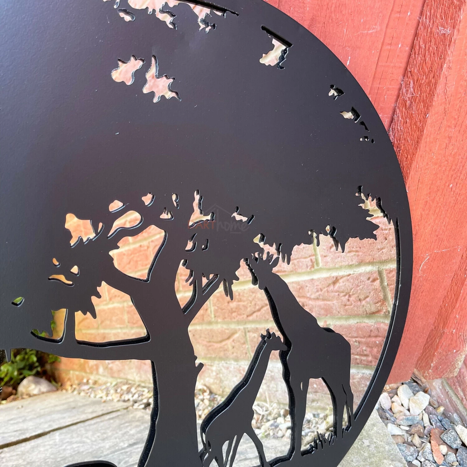This round contemporary wall mounted mirror is suitable for indoor and outdoor use. Its frame is made from metal in a deep black finish, in a tree with giraffe and elephant safari design giving a silhouette style look.