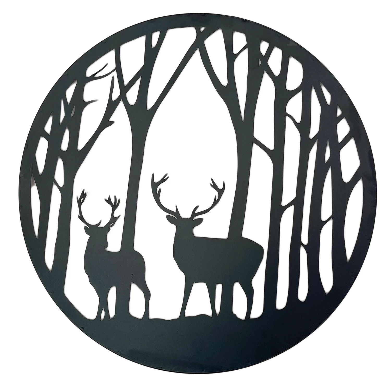 This silhouette black wall art captures a beautiful animal scene with forests and stags. It can be used indoors and outdoors and is a wall mounted piece.