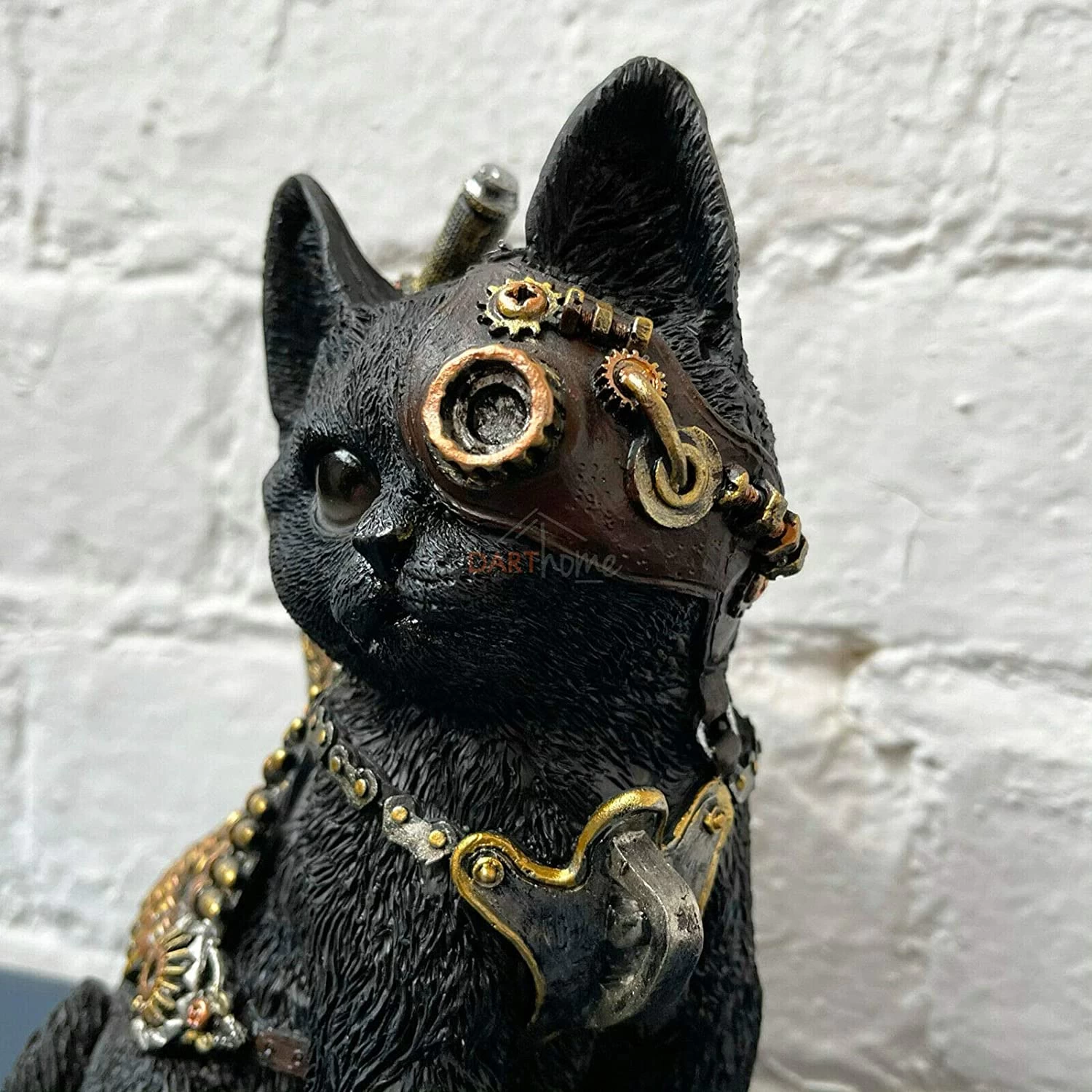 This is a fantastic steampunk themed resin black sitting kitten statue. It is finished with a deep black colour with bronzegolden and silver finished mechanical parts. Brilliant gift idea for the sci-fi, gothic and fantasy lovers out there.