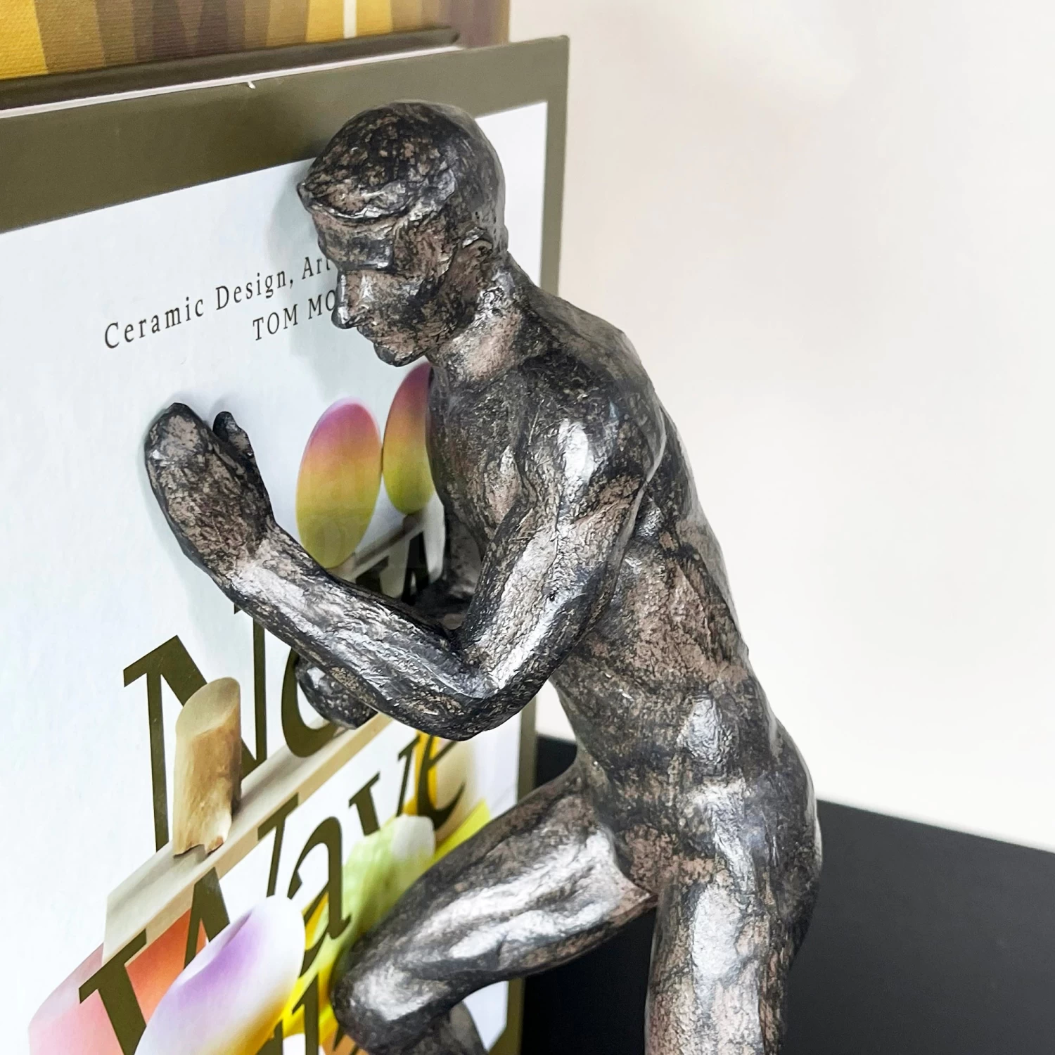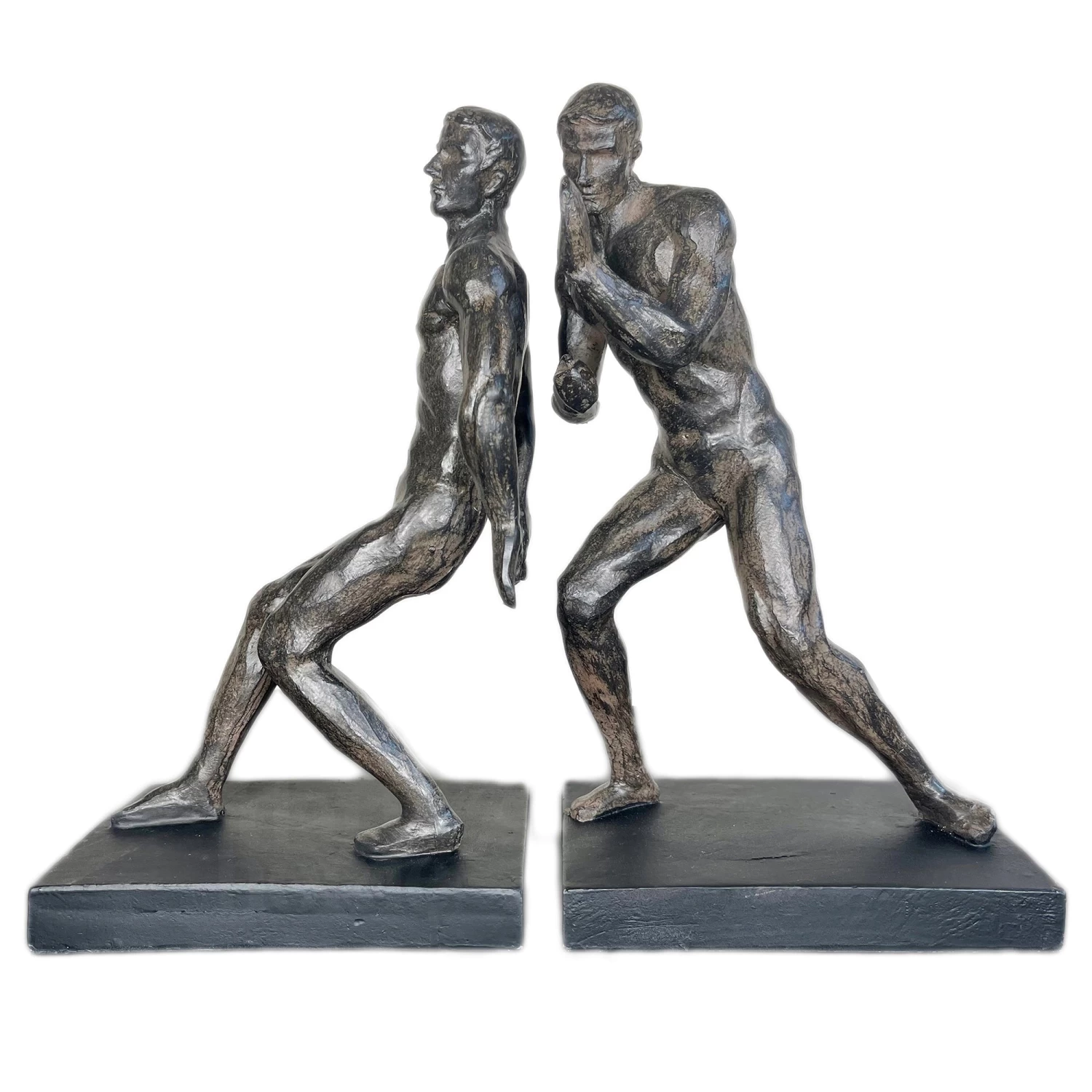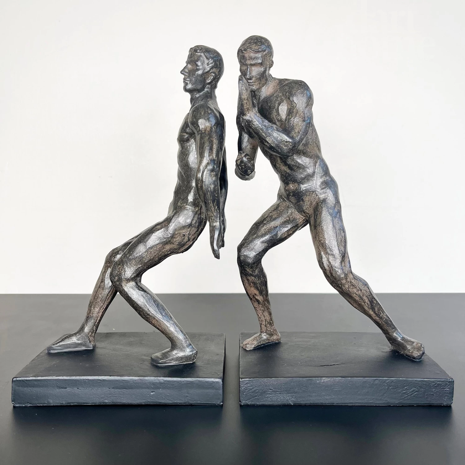 These large heavy duty bookends feature a pair of strong men pushing your books into place on your shelf. Finished in a distressed neutral black shade and placed upon thick rectangular bases, these man bookends will easily fit into any existing decor as well as bringing an artistic human element with them.