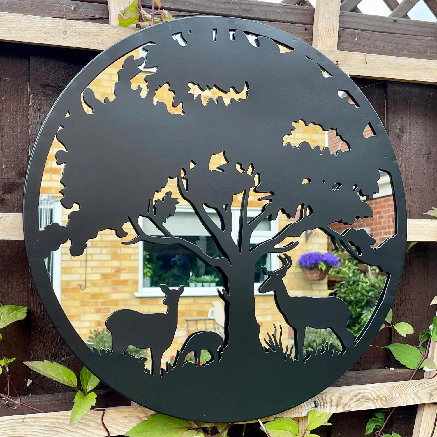 - Features: Black Silhouette, Round Frame, Outdoor, Tree Of Life, Deer Family, Baby Deer