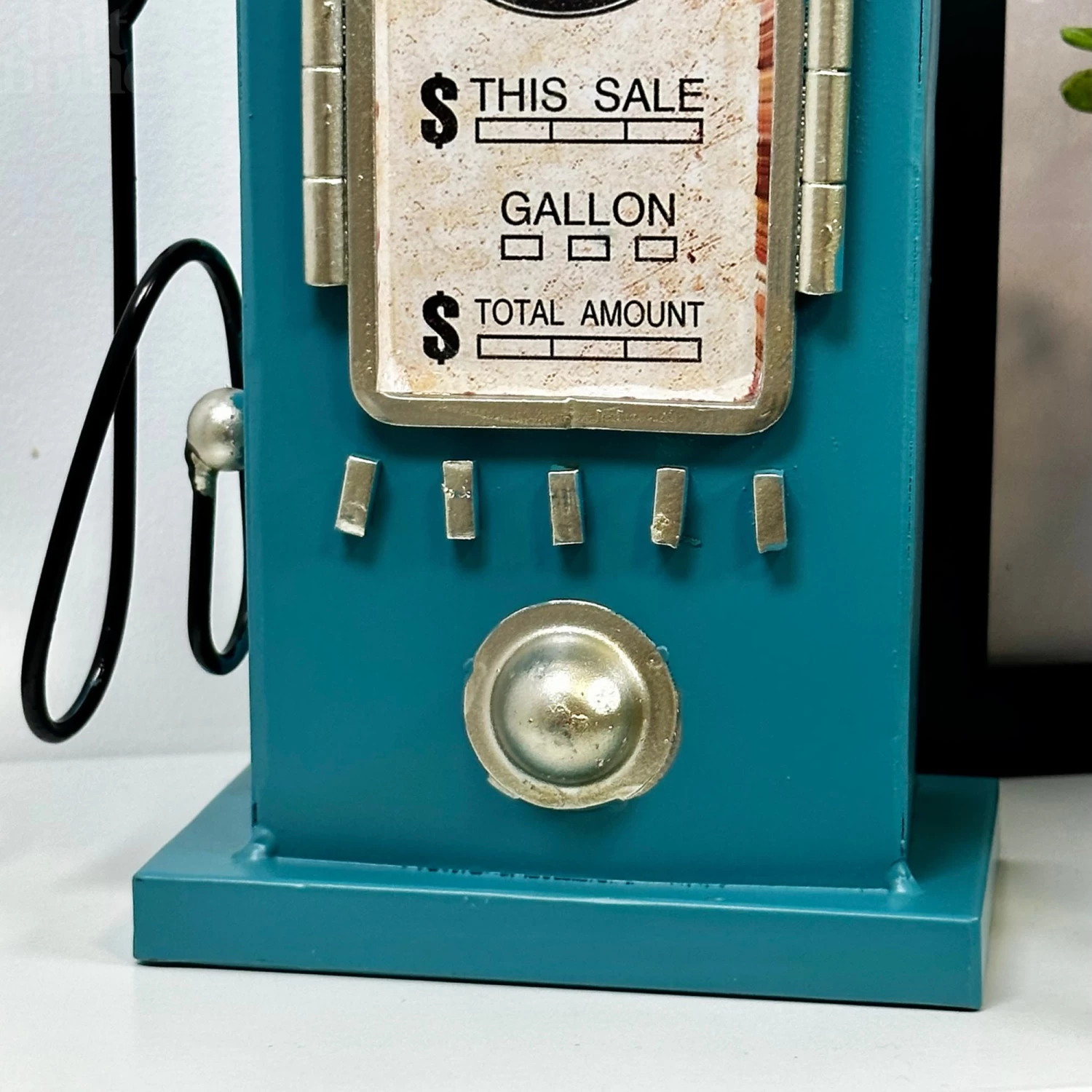 A quirky table clock featuring an antique style blue petrol pump, perfect for a fathers day gift to style on a desk or table. This blue petrol pump clock is made from metal with a metallic finish. It features an arabic numeral 12 hour display and is battery operated with 1x AA battery that is not supplied.
