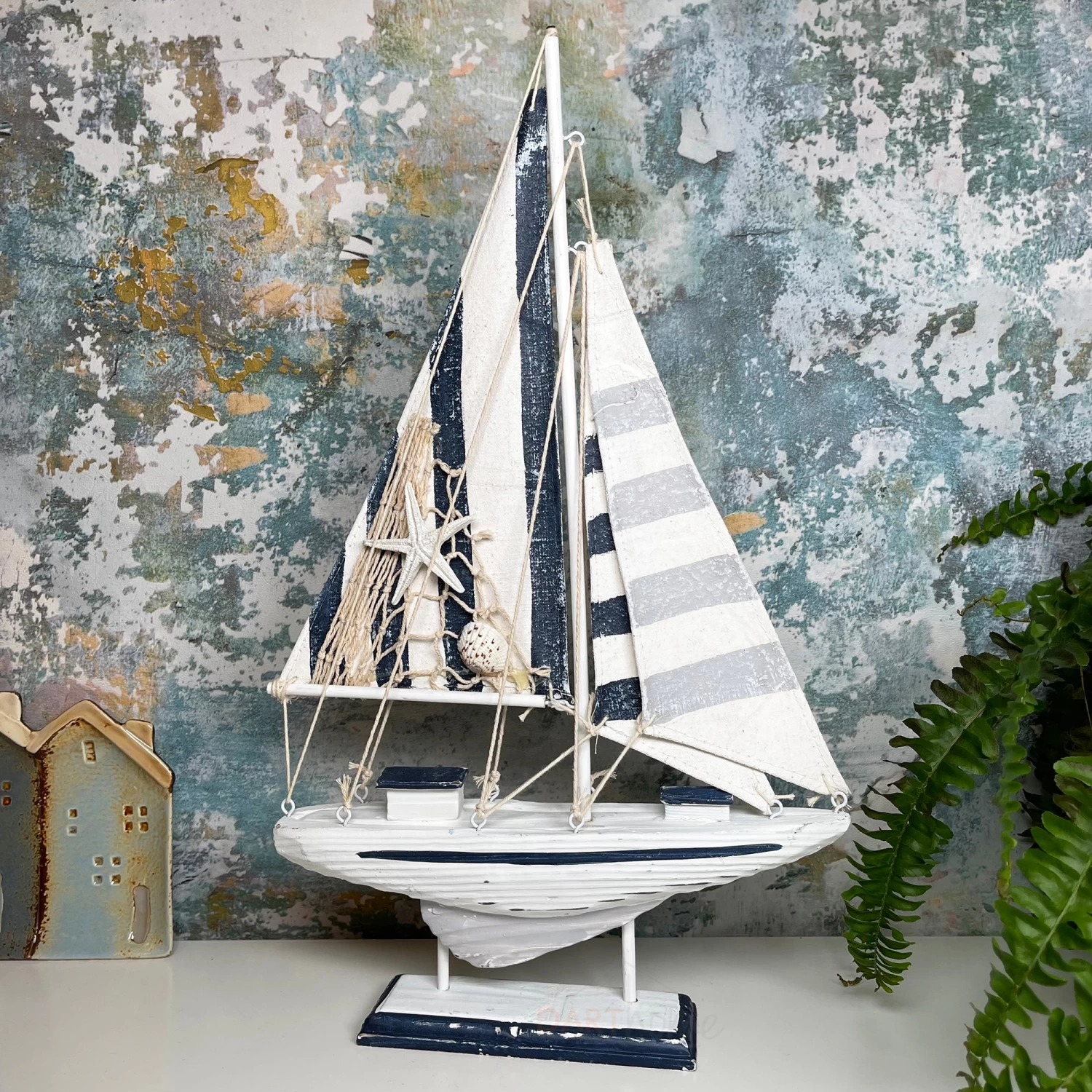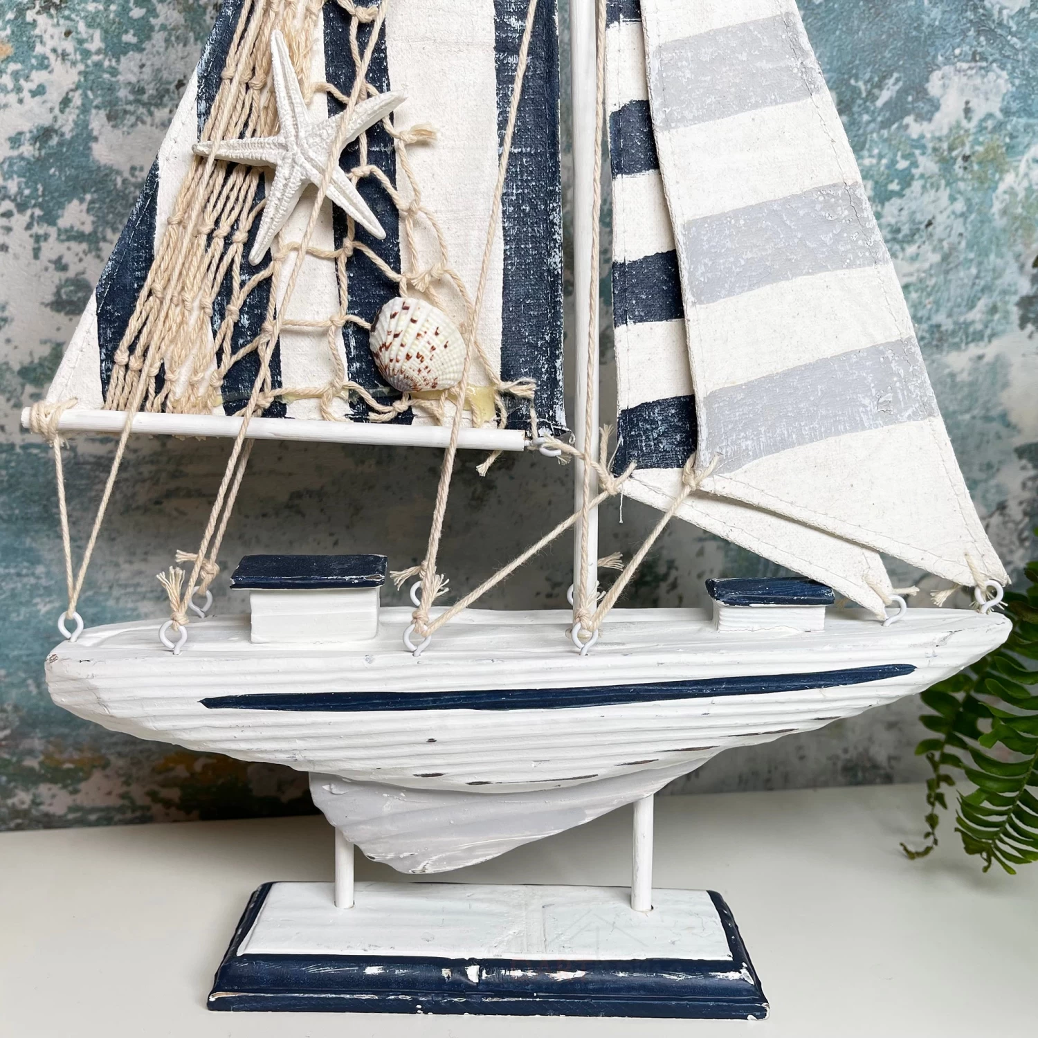 A stunning vintage style wooden made sailing yacht model with fabric blue and white striped sails. This ornament comes on a white rectangular stand. It is a great gift idea for a boat enthusiast. The boat is white with blue trims.