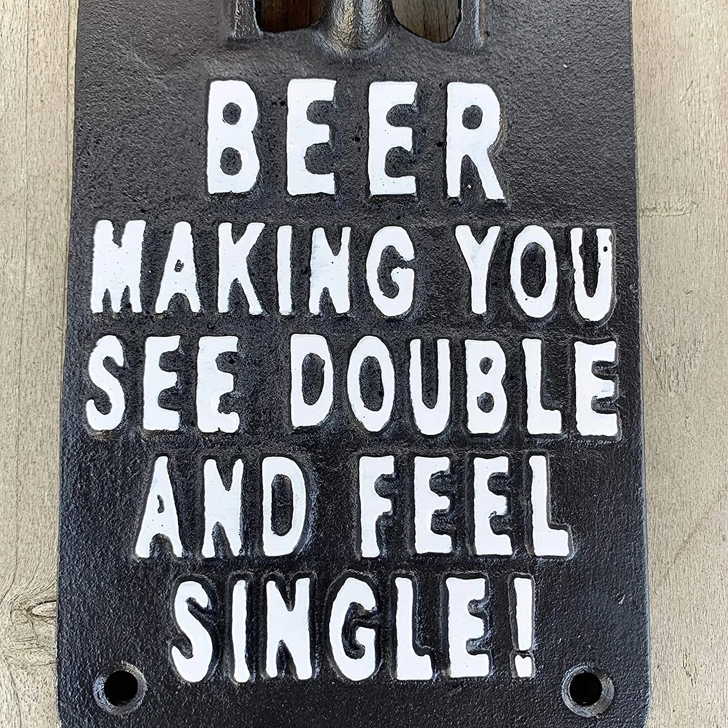 This novelty wall mounted single bottle opener is an incredibly convenient product that every party host needs in their garden. Make your friends laugh whilst they open their drink with embossed white lettering reading ‘Beer making you see double and feel single’.