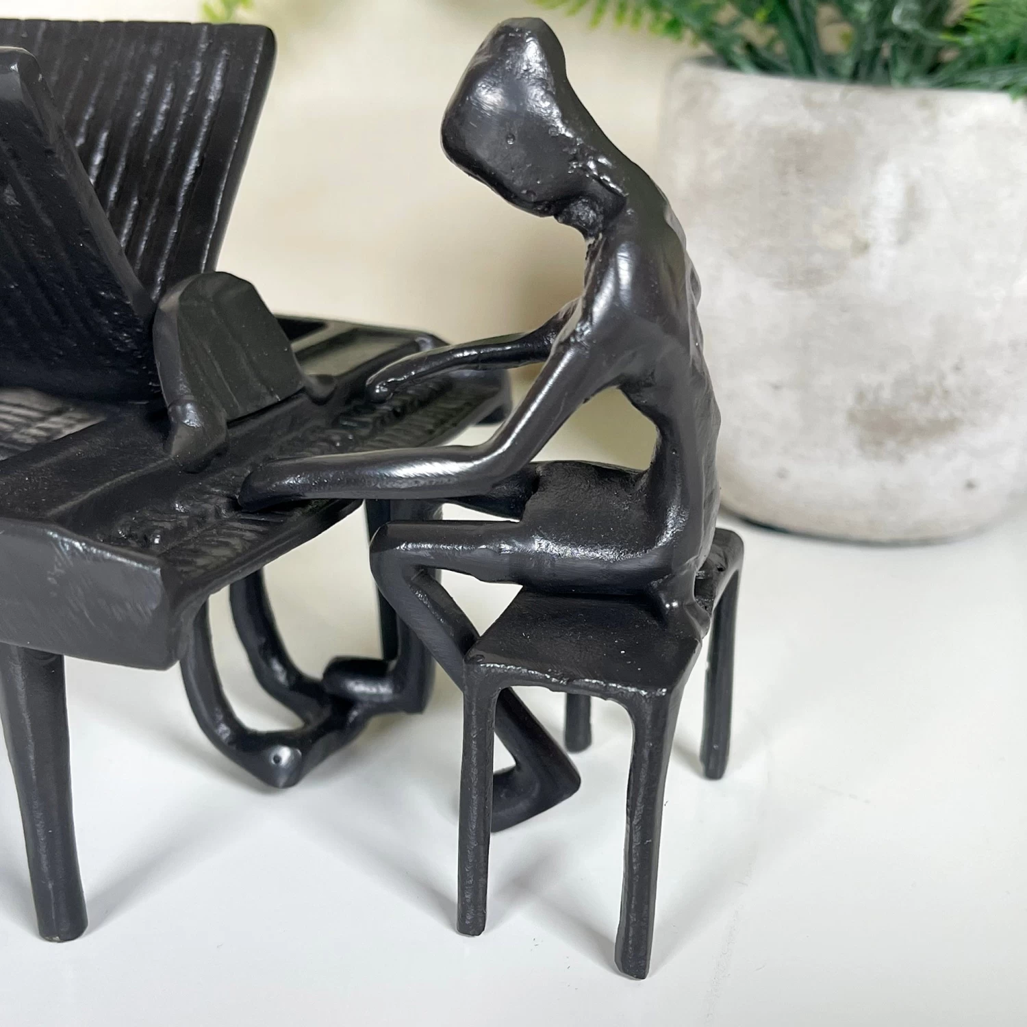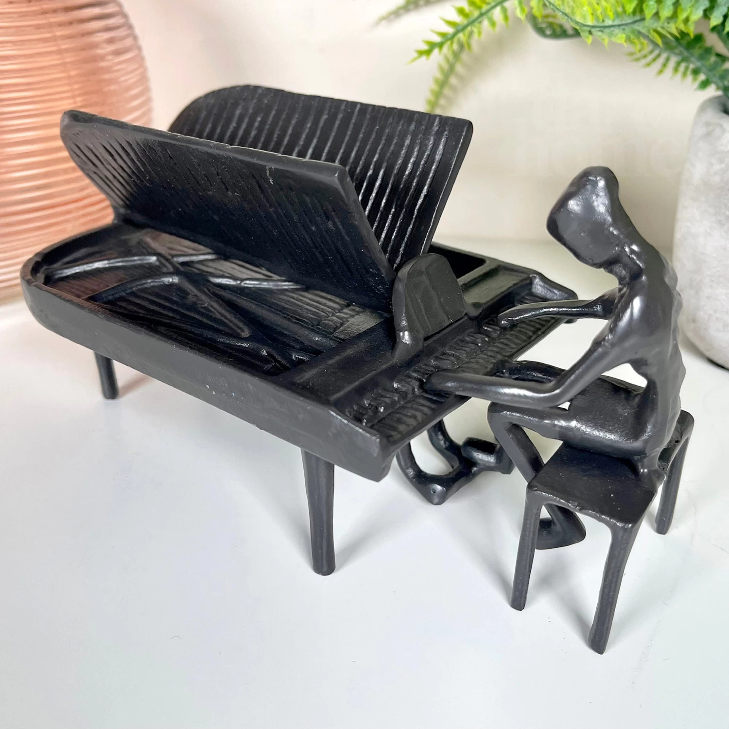 A quirky black cast iron silhouette figurine capturing a piano playing man, which will sit perfectly and freely on the shelf in the living room or bedroom. Perfect gift idea for a piano playing musician.