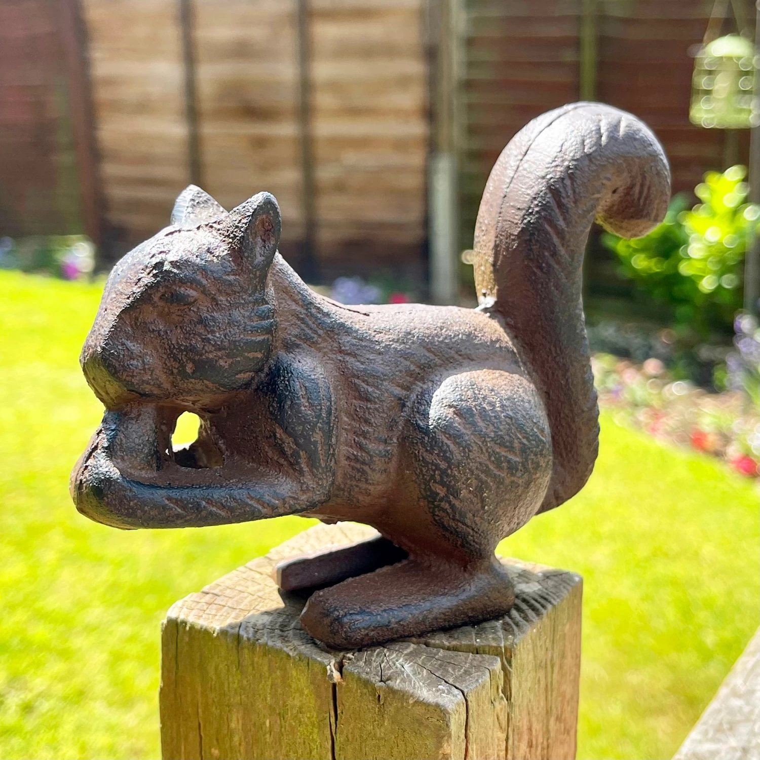 Squirrel eating nut ornament made from cast iron with a distressed brown finish. This is an indoor and outdoor sculpture and would make a great addition to any home or garden.