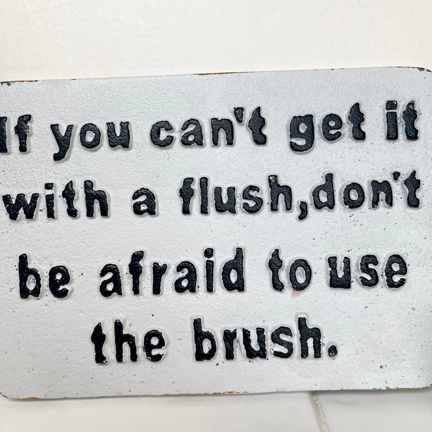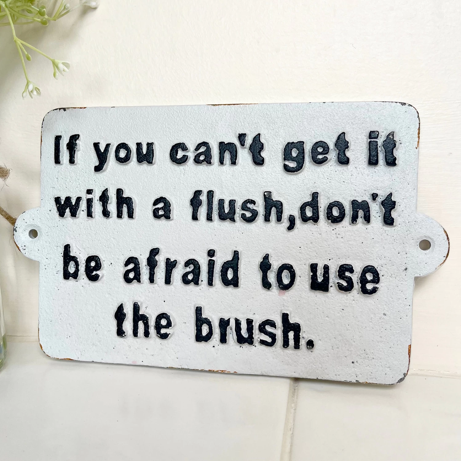 This wall mounted sign has a distressed vintage white finish. It is made from high quality cast iron, designed for indoor or outdoor use. The text reads ‘If you can’t get it with a flush, don’t be afraid to use the brush’. It will look great in your toilet or restroom.
