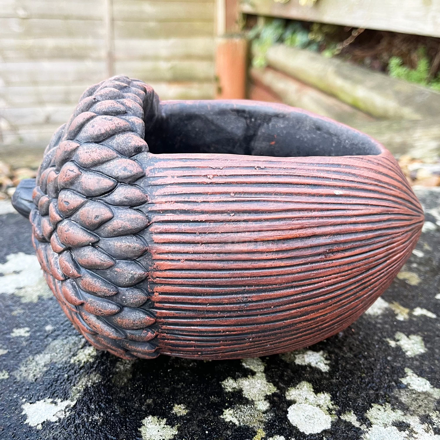 Cement acorn planter with intricately detailed paintwork to maximise natural realism with this nut sculpture. This pot has an approx 1.1L capacity with a drainage hole and plug included suitable for indoor and outdoor purposes.