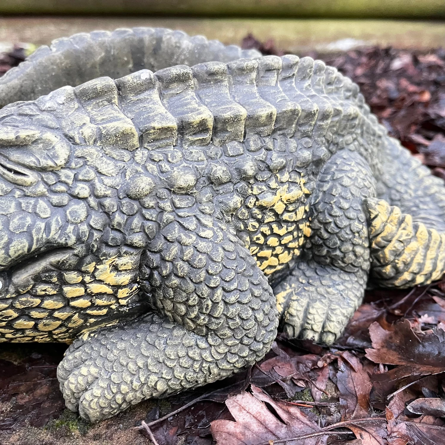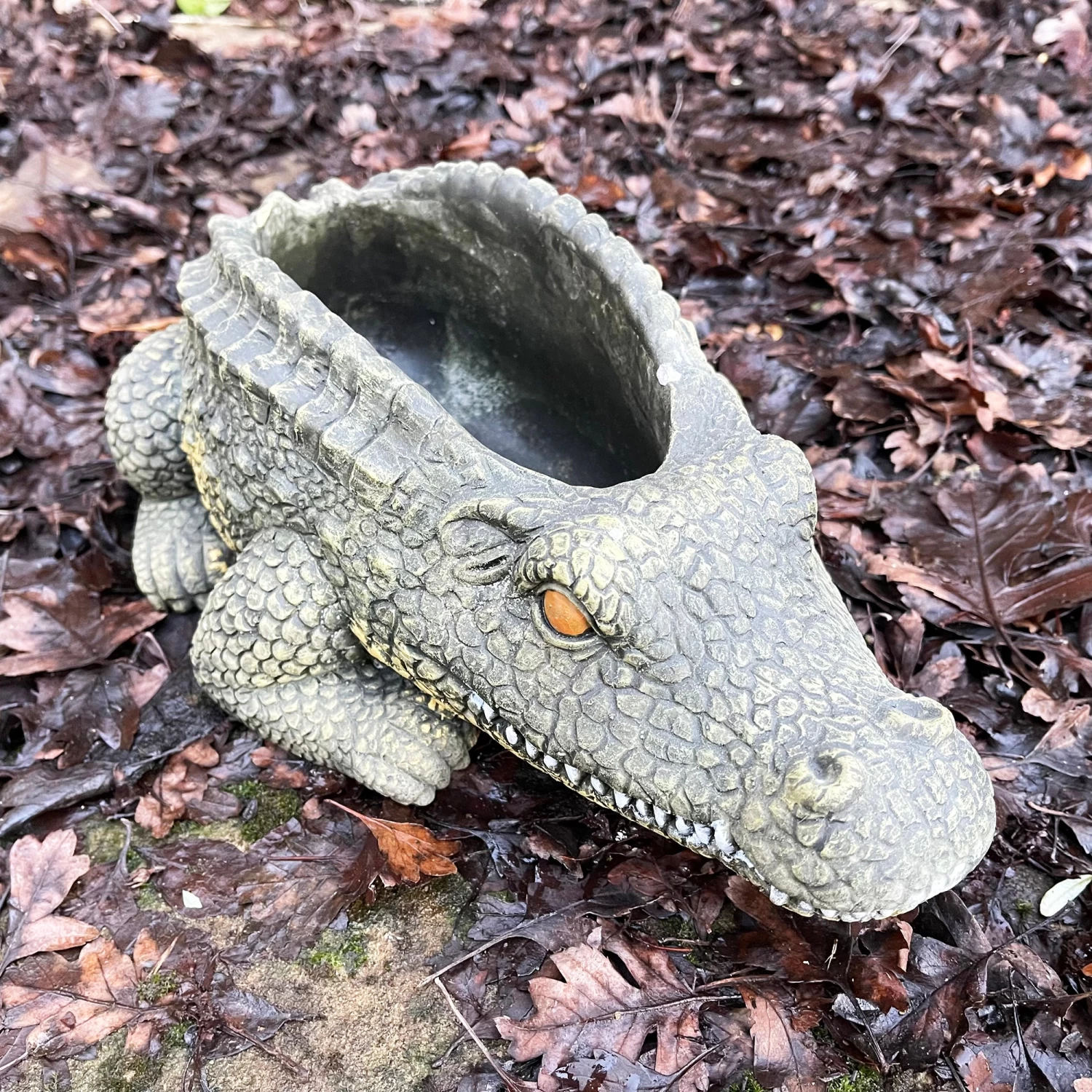 Outdoor cement planter in a heavy duty green Crocodile design. This reptile themed flower pot has an oval space to hold your favourite herbs or flowers and has a drainage hole. It is a great gift idea for a lizard loving friend.