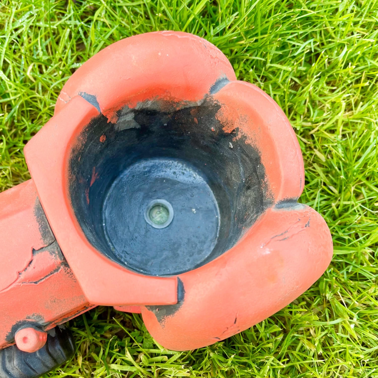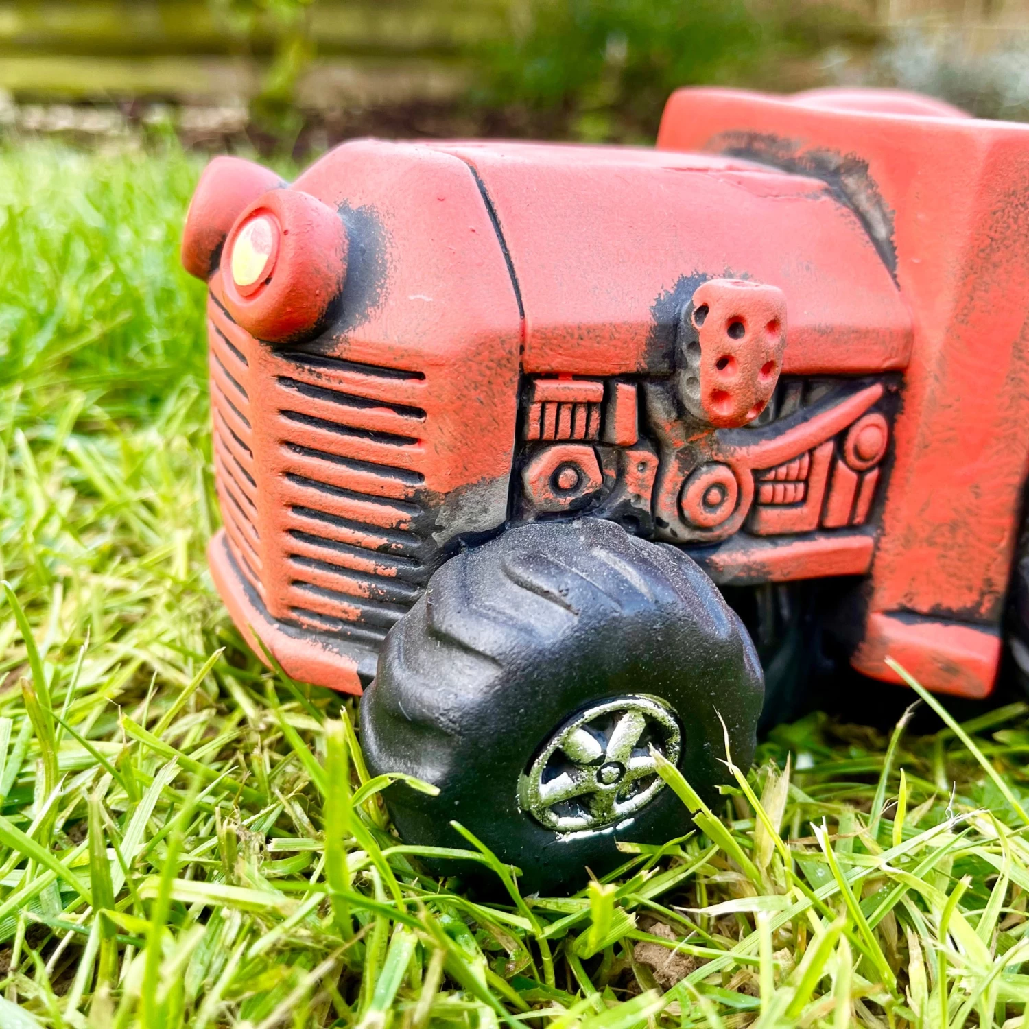 Outdoor novelty plant pot in an orange tractor truck design. This vehicle themed flower pot has a round space to hold your favourite herbs or flowers and has a drainage hole. It is a great gift idea for a farmer friend.