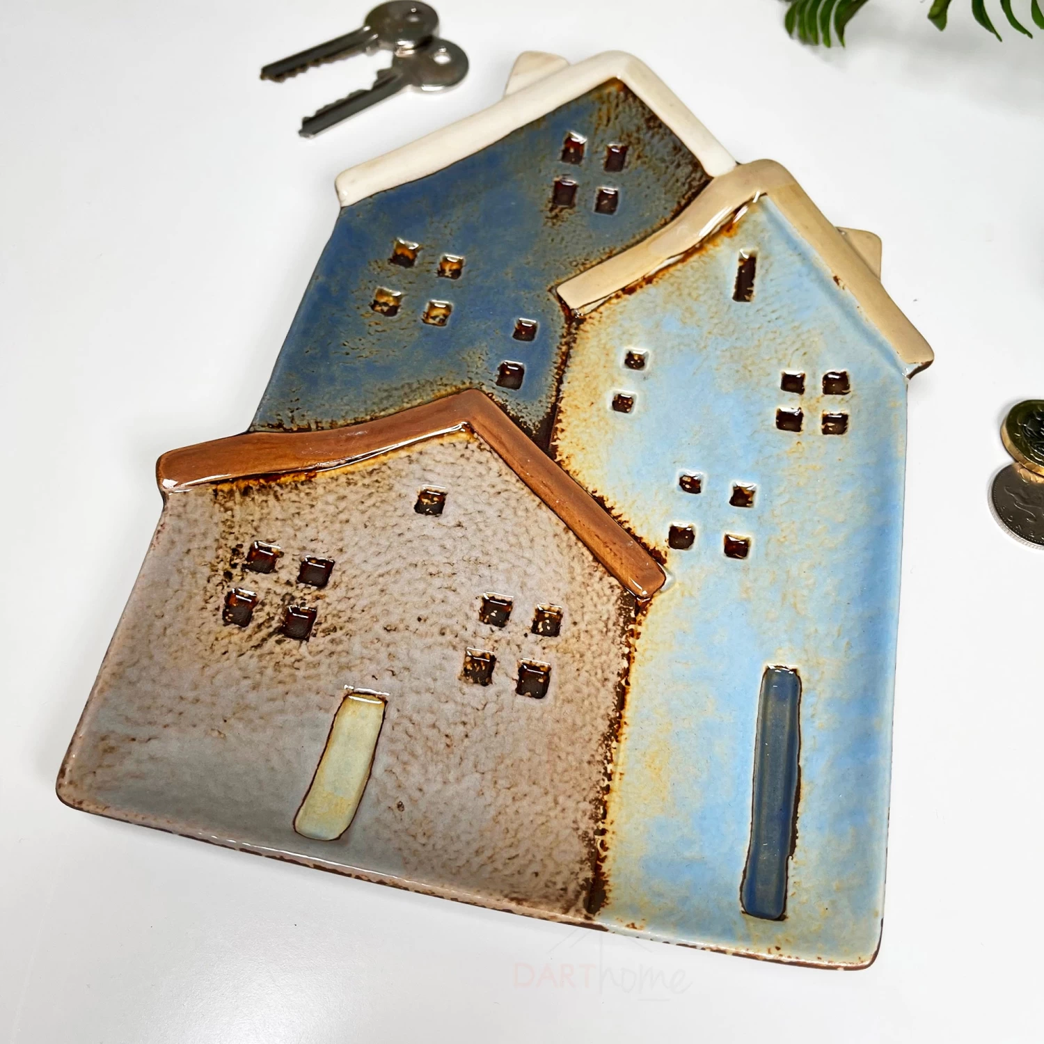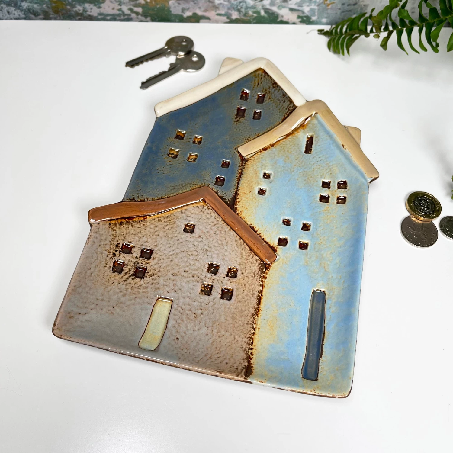 A neutral coloured decorative plate in a retro country style cottage houses in a glazed, distressed finish. Would add a touch of seaside charm to your sideboard or bedside table. Also suitable for coins, change, keys & jewellery.