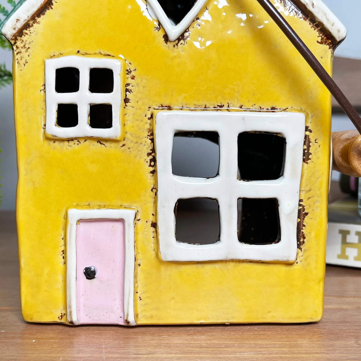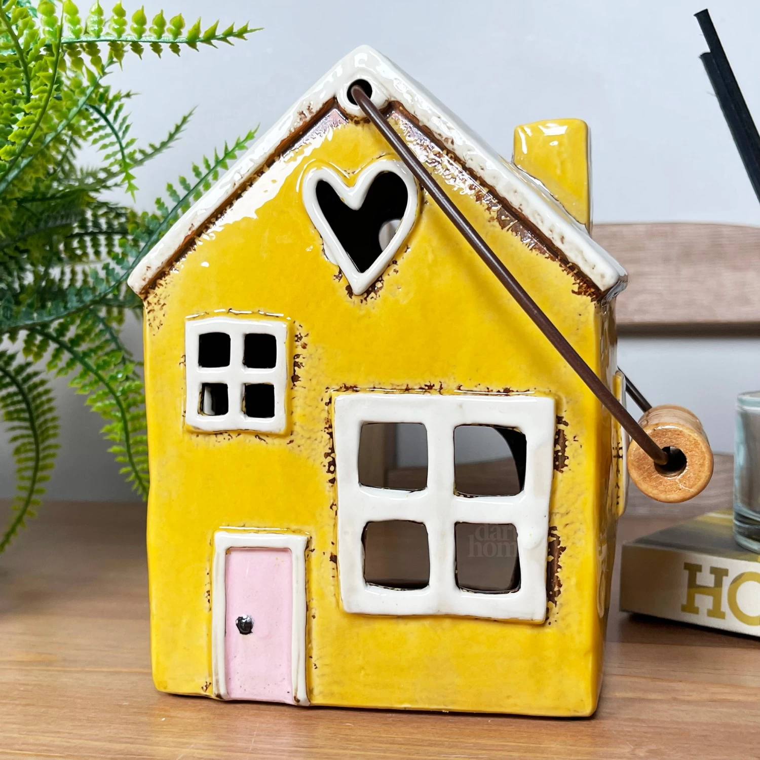This perfect medium sized ceramic yellow house candle holder with a love heart cut-out decoration and welcoming luscious pink door, all delocately made and completed with a glazed finish. Fix this detachable wooden handle onto your lantern to hang or stand freely. Care instructions: Wipe with damp cloth.
