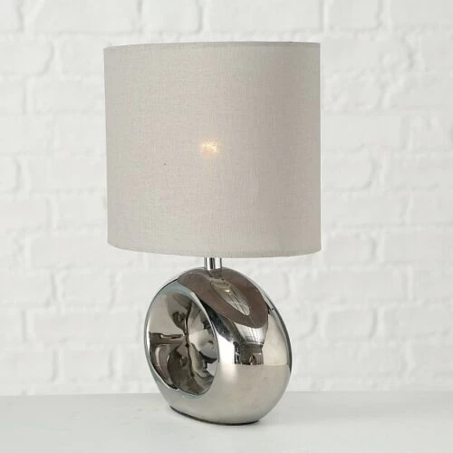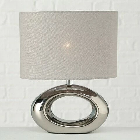 A beautifully modern table lamp, with a chrome oval base and cream lampshade. It works as a great reading light and desk lamp.