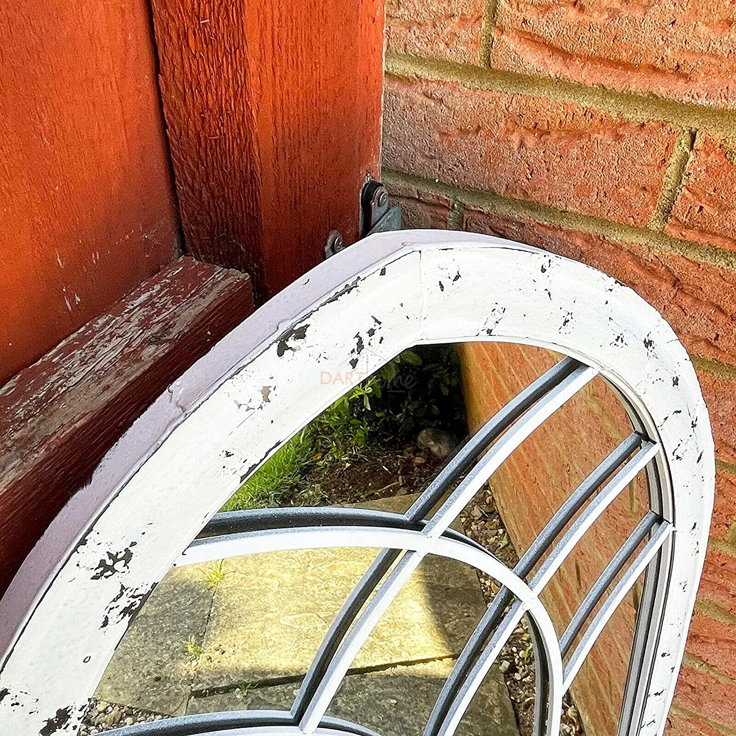 This metal arch wall mirror has a distressed white finish and is perfect to reflect light and add depth to any garden or home.