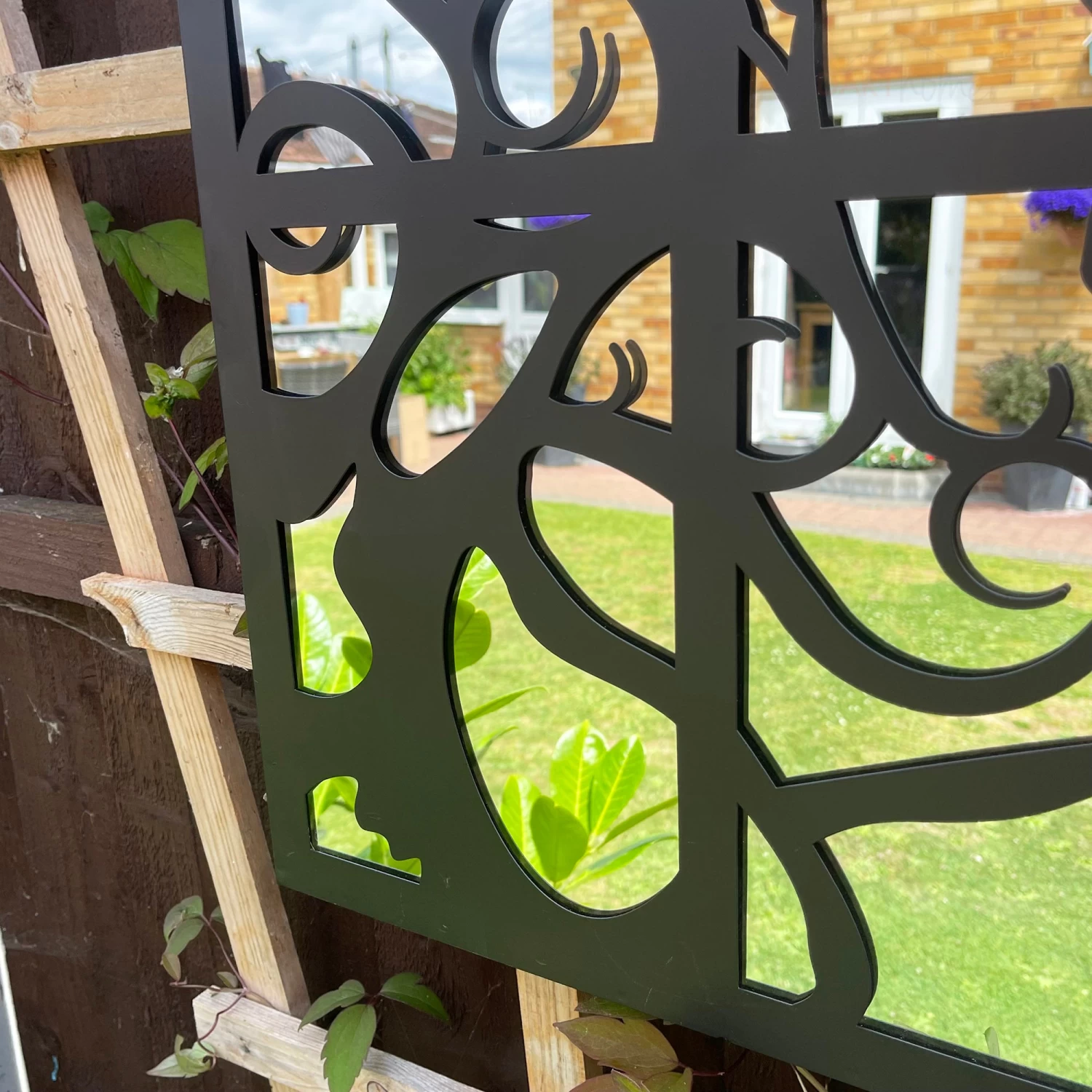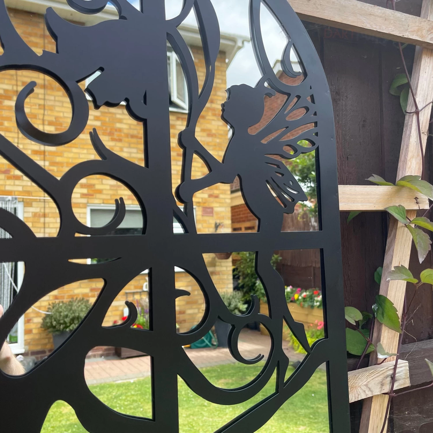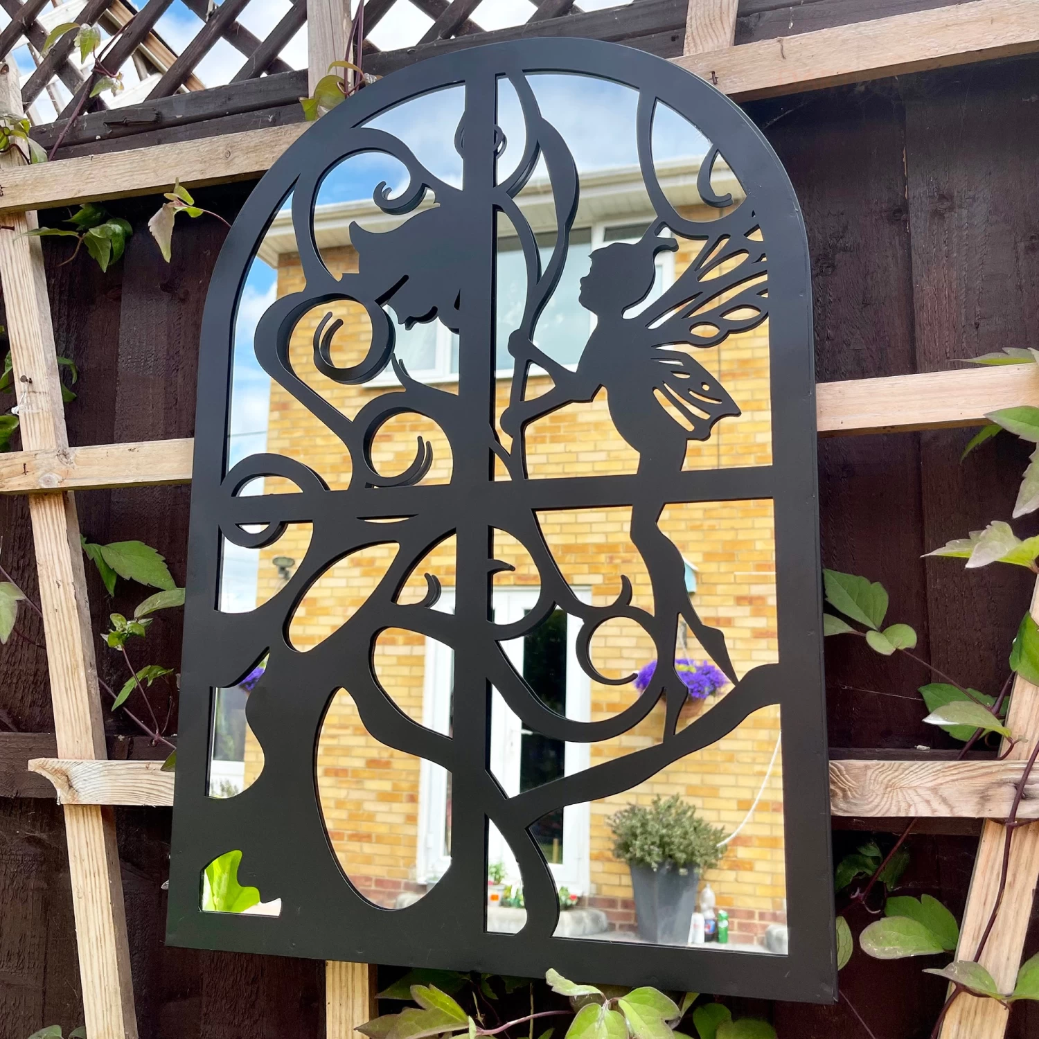 This round contemporary wall mounted mirror fashions a mythical fairy sitting elegantly in a window and is suitable for indoor and outdoor use. Its frame is made from metal in a deep black finish offering a silhouette effect when shining in the outdoor sun.