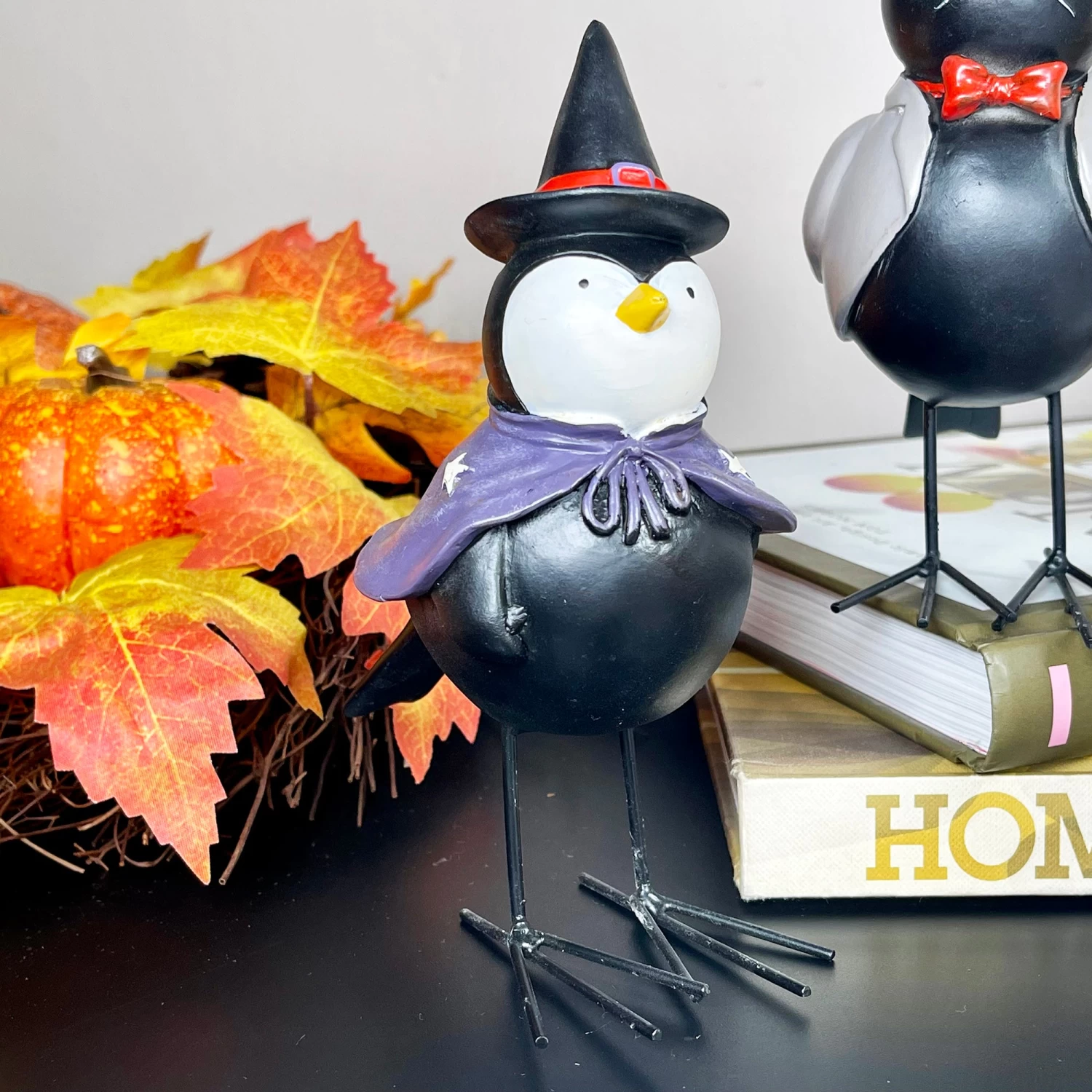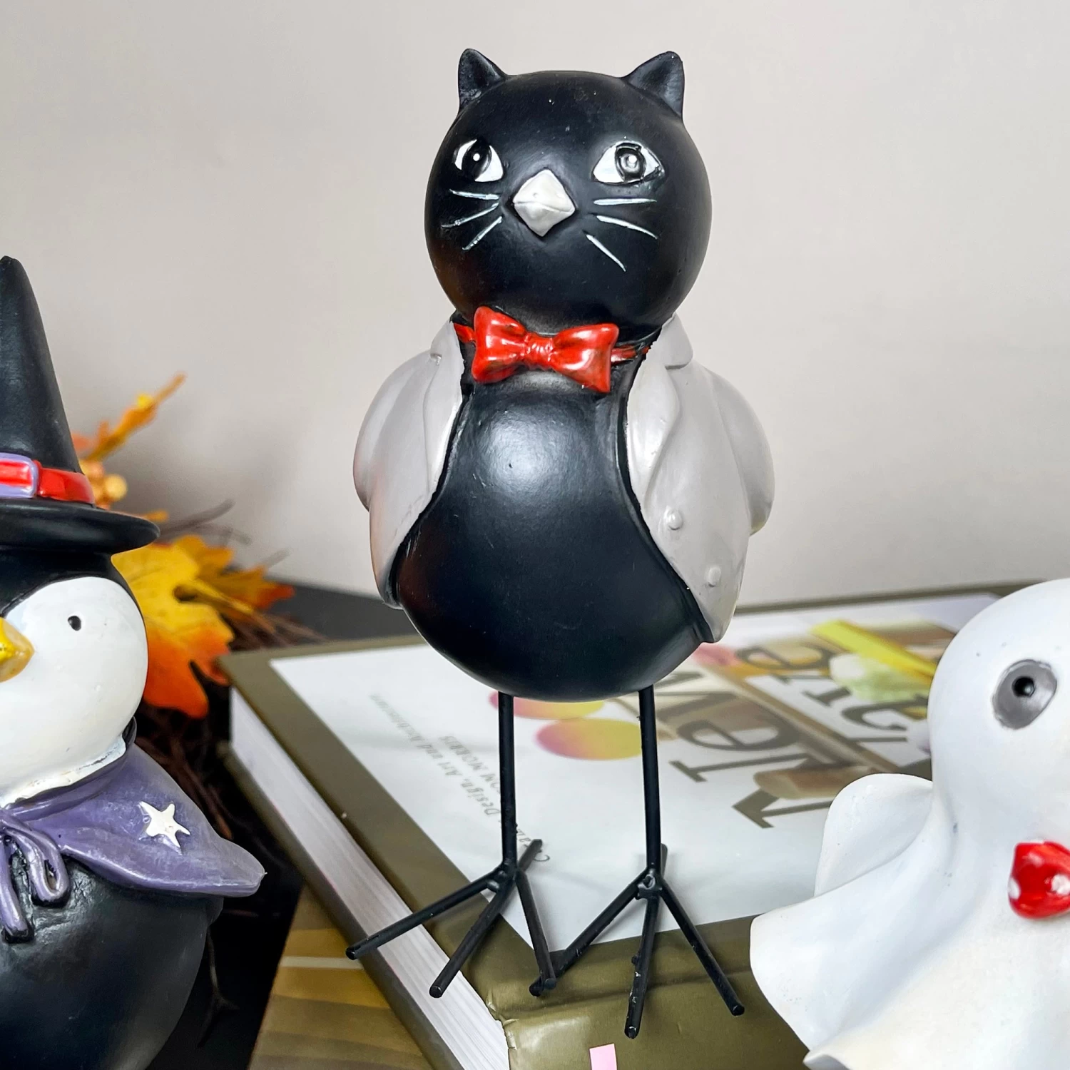 A quirky set of 4 bird figurines dressed in fancy dress costumes ready for halloween. Made from resin with long black metal legs, these shelf sitters are perfect for mantle or windowsill decoration over the halloween period. This is an assorted set. In this set you will receive, a ghost, cat, pumpkin and cat dressed bird.