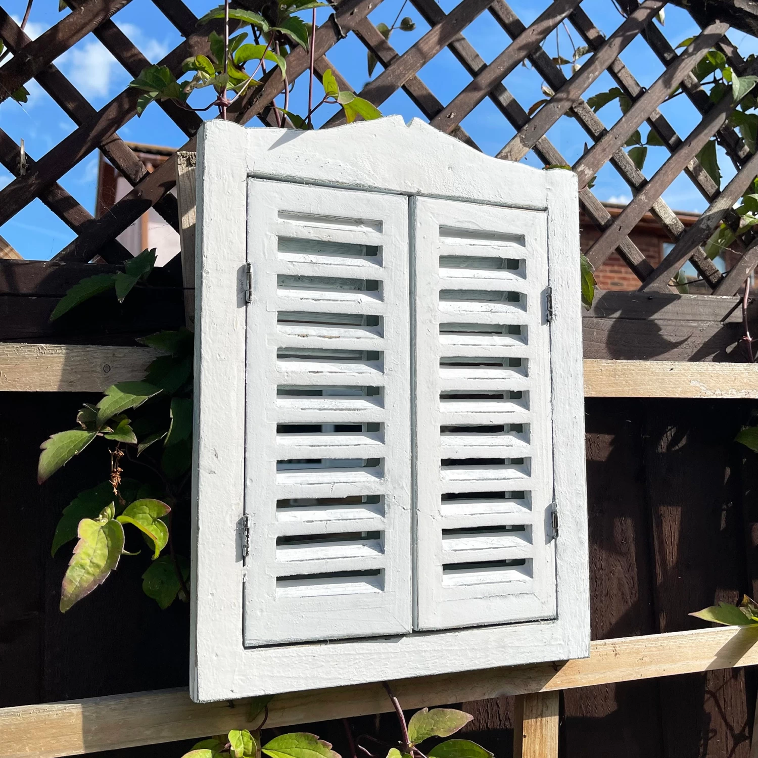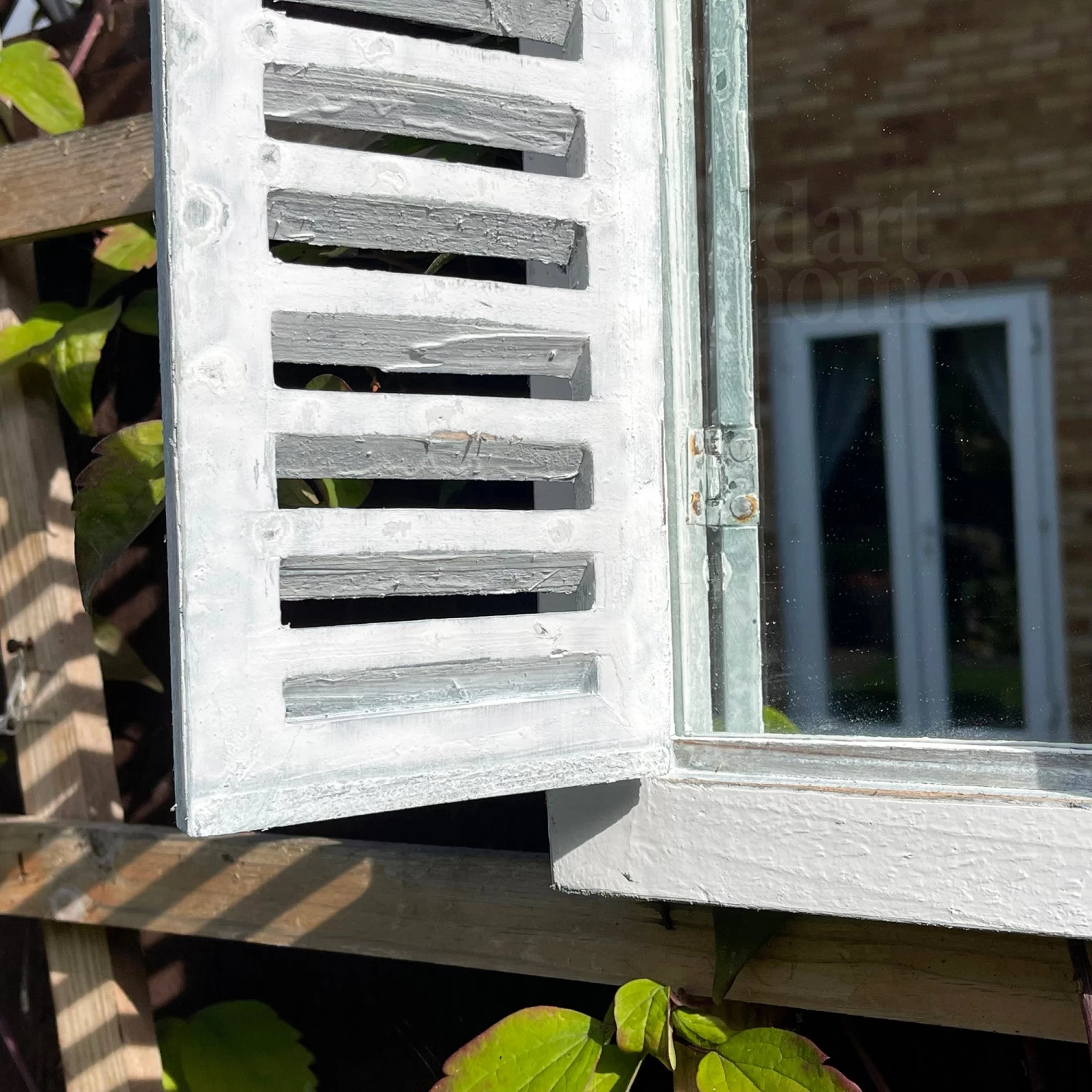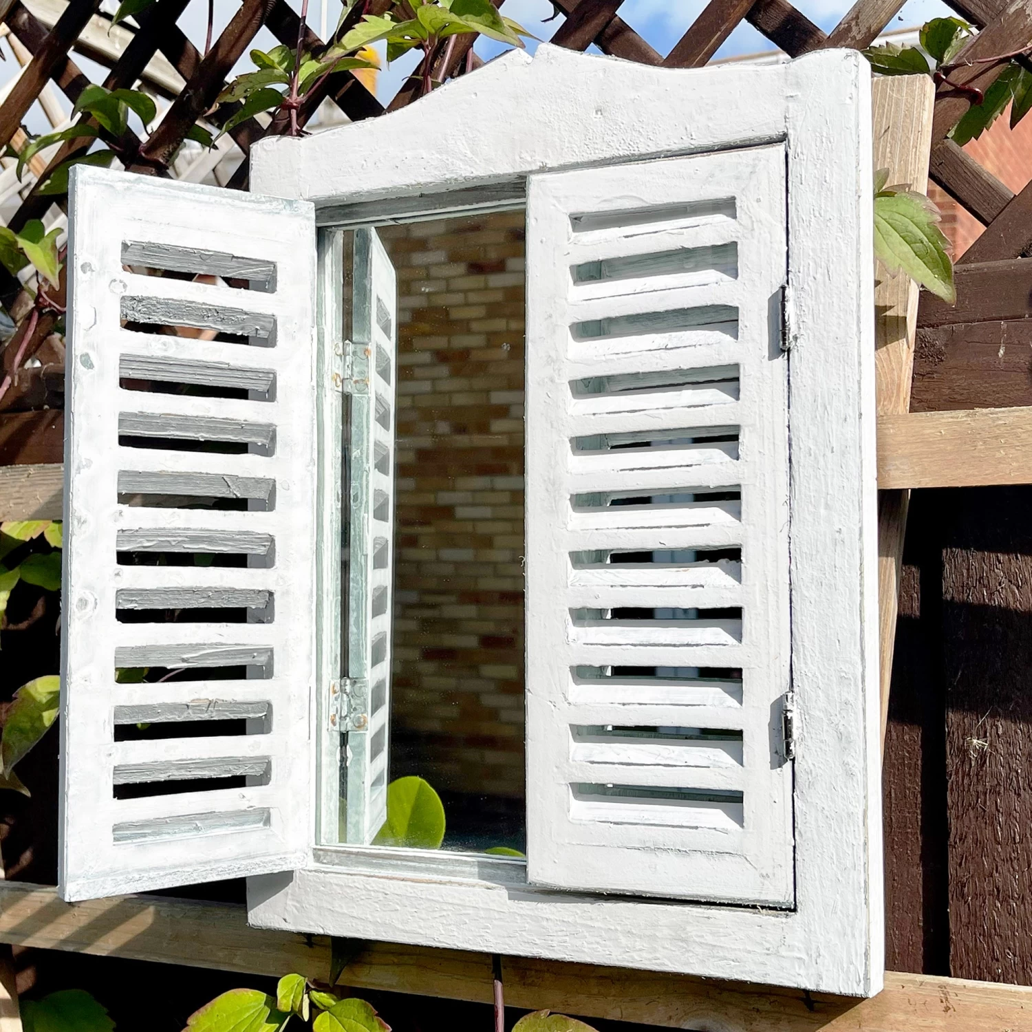 This 40cm x 30cm quaint decorative shutter window mirror boasts a a stunning french country style with a distressed white finish. The pair shutters opening up the rectangular mirror backing creates a wonderful illusion of space and light on your garden wall which enhances your outdoor space.