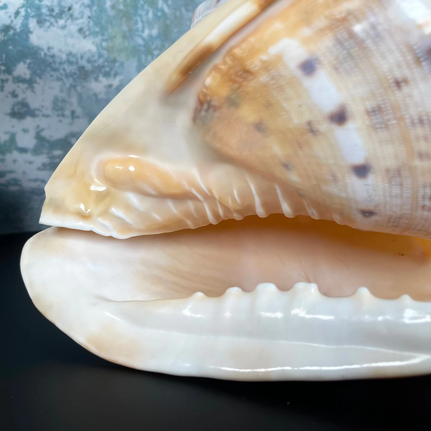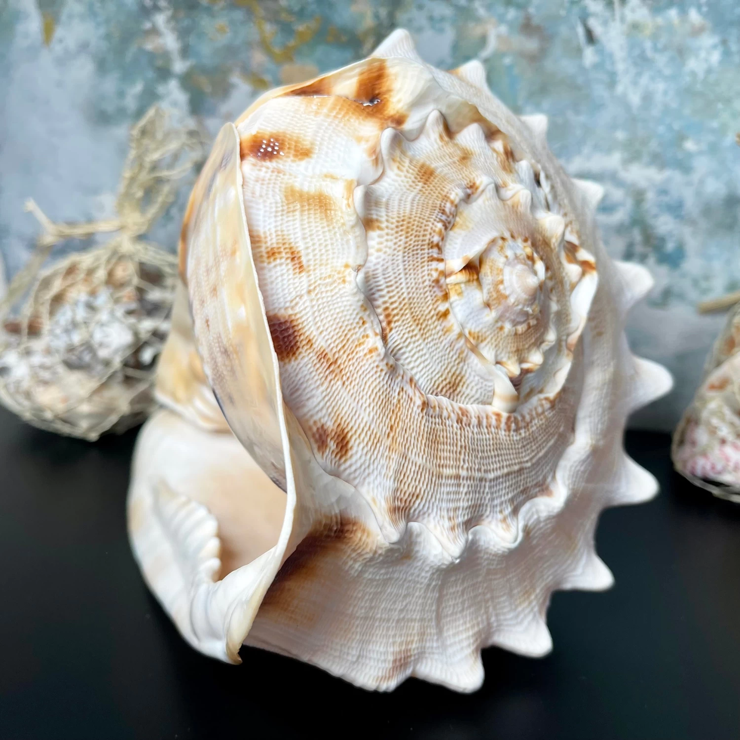 Finished with a white and brown soft tone, these giant horned queen helmet shells, originating from the famous Cassis Cornuta are perfect for bathroom decoration filled with a nautical theme.