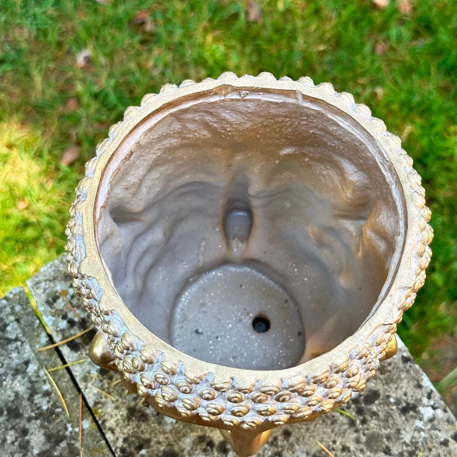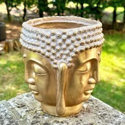 Bring a touch of zen to the outdoors with this elegant Gold Buddha Head Planter! Crafted of resin with a shiny finish, this multi-face pot is perfect for enhancing any garden or patio space. Get ready to add a calming, inspiring atmosphere to your home!