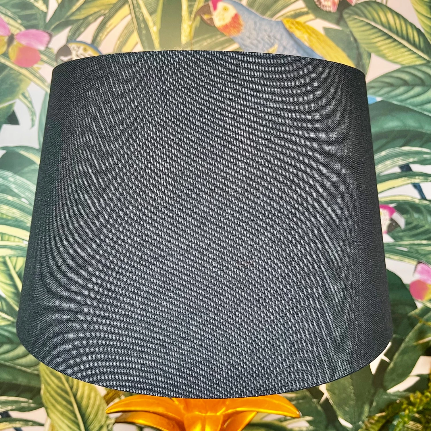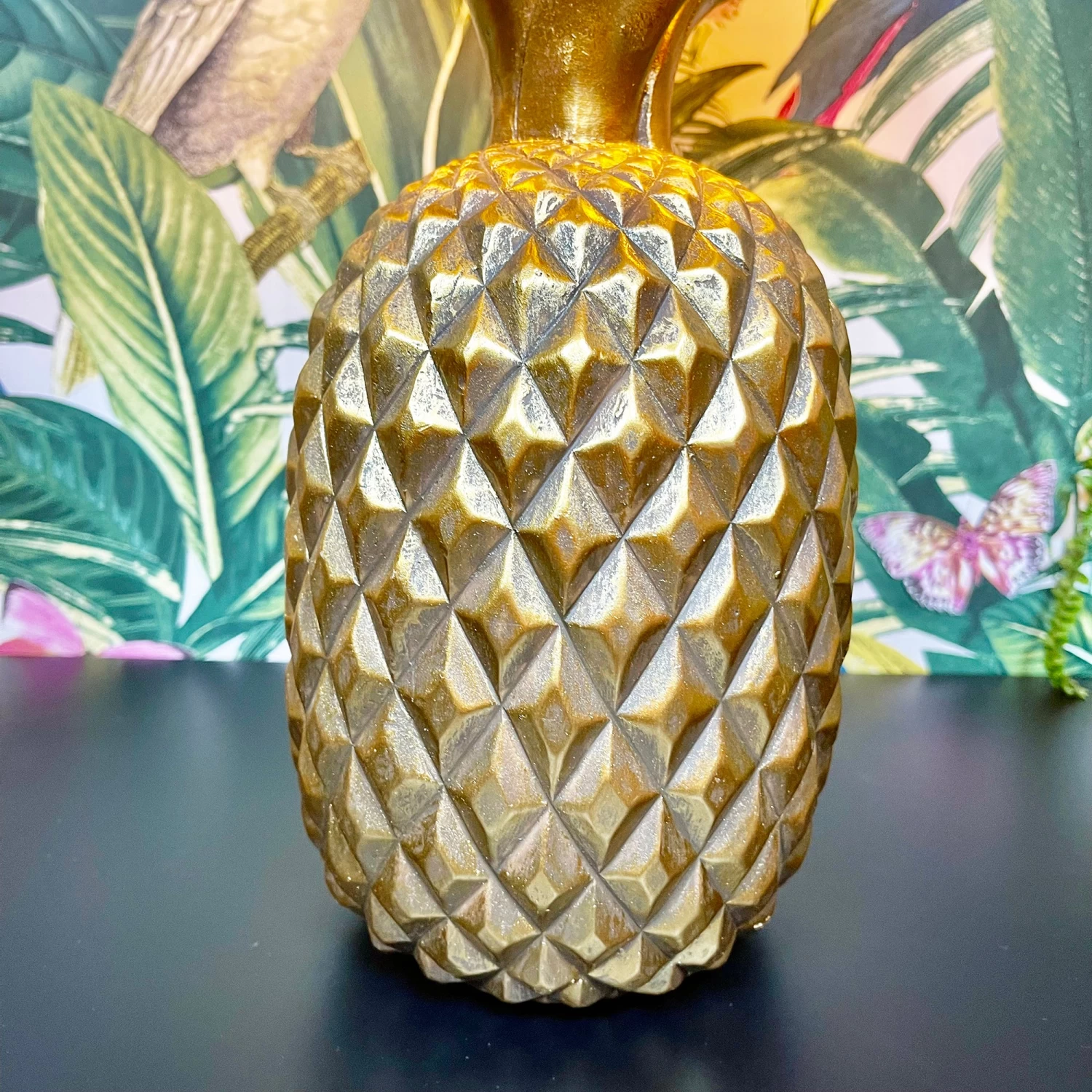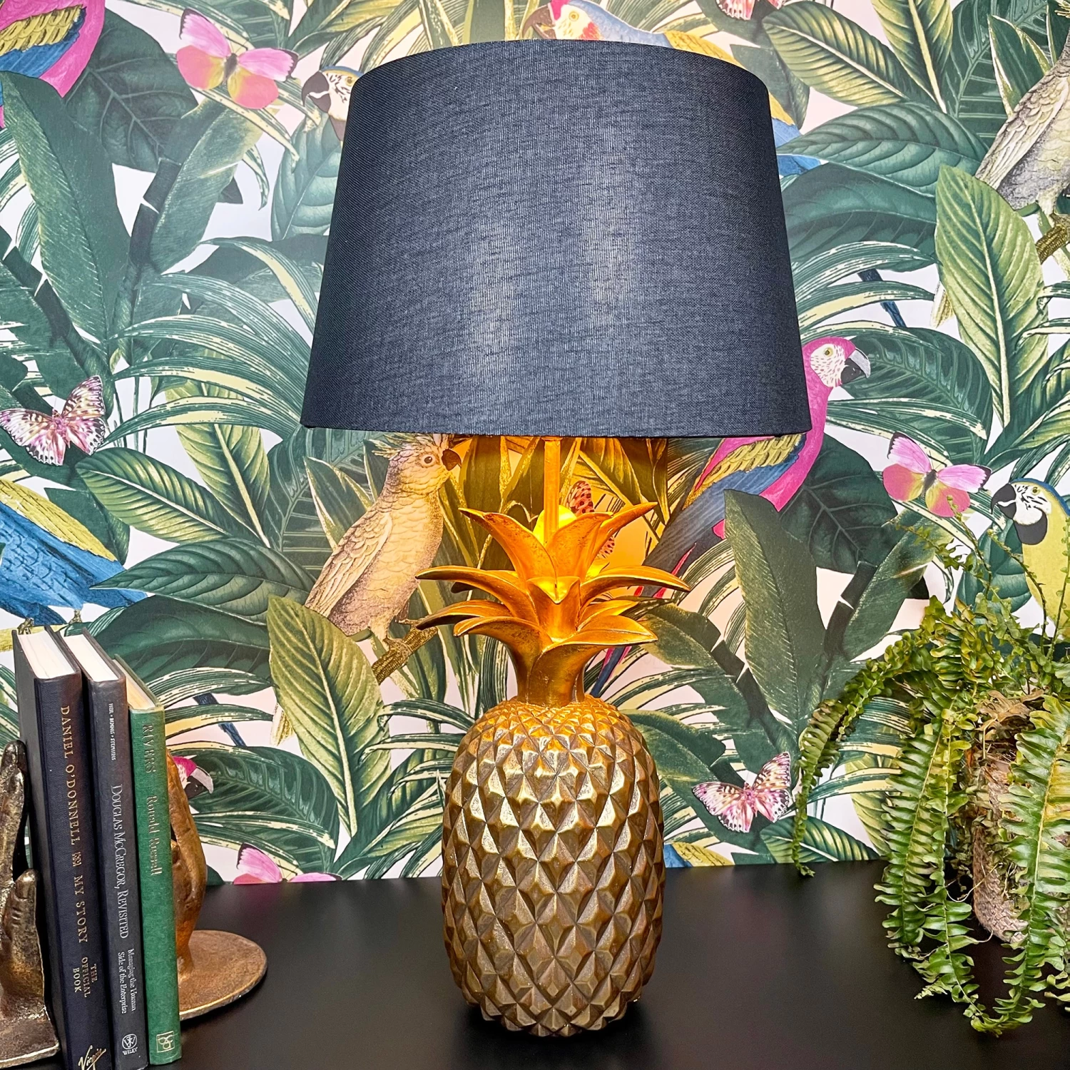 This beautiful large table lamp featuring an exotic pineapple design in a metallic gold finish will instantly enhance your homes decor wherever it is placed. Made from resin, the intricate detailing of the exotic fruit adds a unique realistic touch to your living room or bedside table. This light, that requires an E27, max 60W bulb will add a warm white glow in any room and be a centrepiece. Lamp comes with a neutral black fabric round shade. No bulb included.