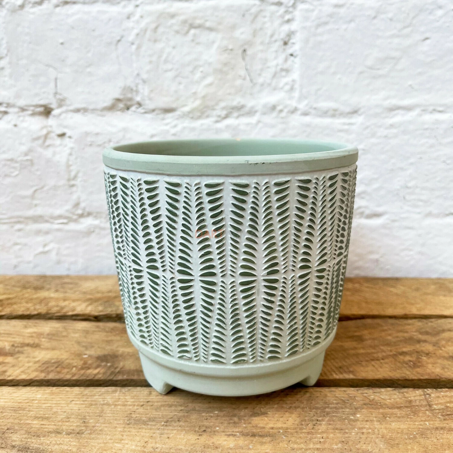 This round indoor & outdoor plant pot has a distressed green finish and is decorated with an embossed diamond geometric pattern. The planter will look great in your home and garden.