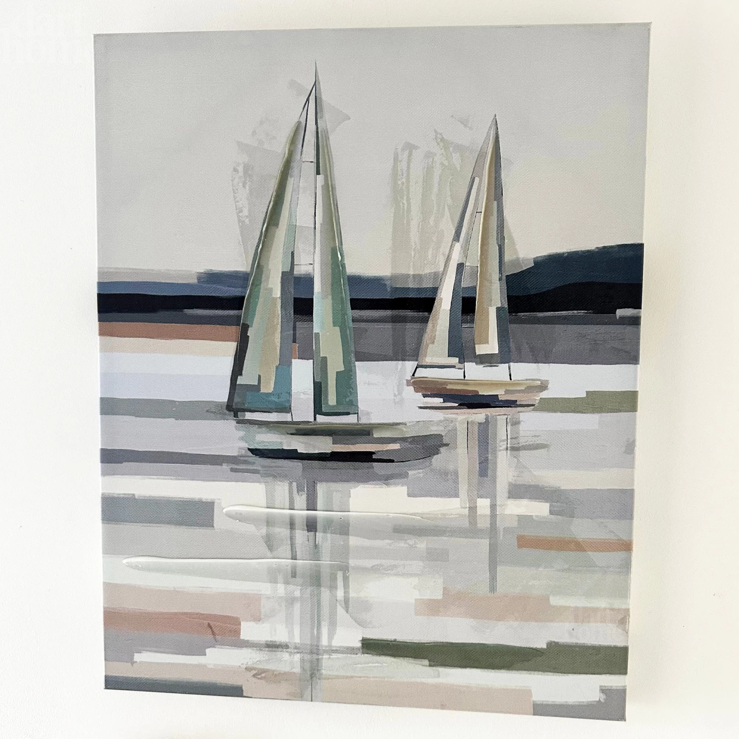Add a statement piece to your bathroom with this stunning abstract sail boat canvas. Soft colours and contemporary in design, this sail boat wall art is the perfect nautical themed art piece to enhance your interior space.