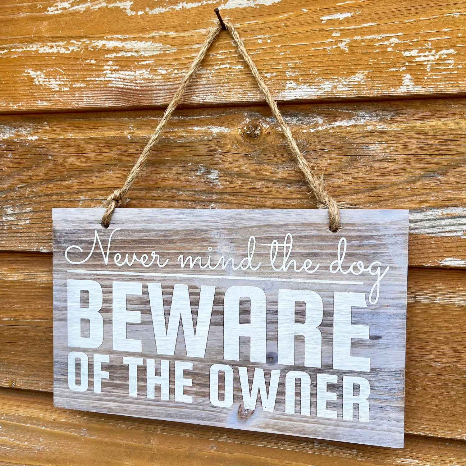 Novelty garden sign made from wood with a distressed finish. This rectangular sign features a humourous novelty quote reading ‘beware of the owner’ painted in bold white text. It has a string hanger meaning it can be hung on any wall, door, gate or fence in your garden.