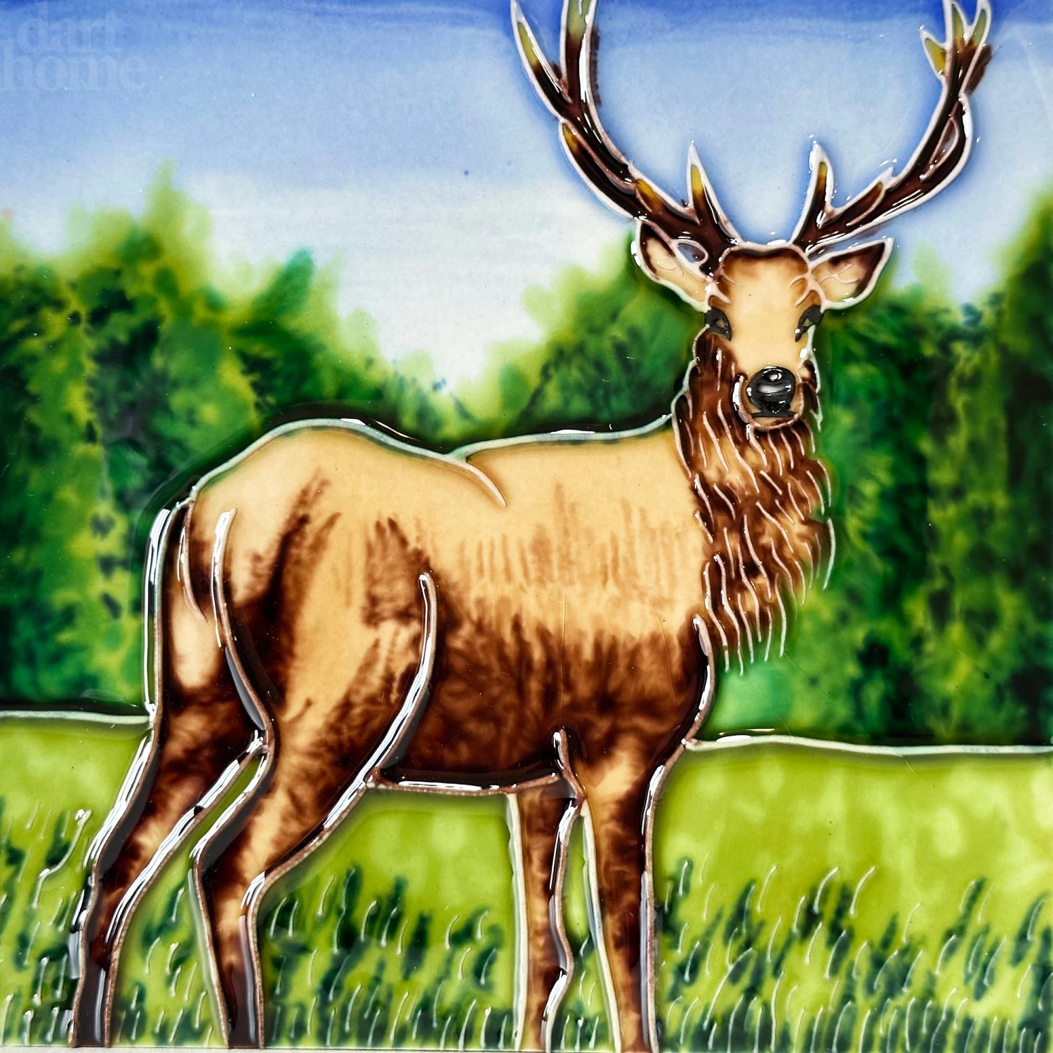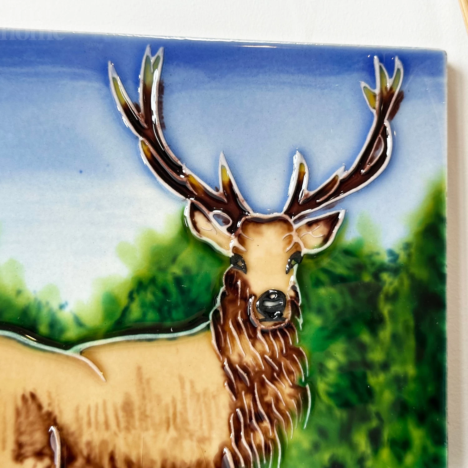 This beautiful square ceramic art tile captures a colourful highland stag in a field with a scenic backdrop. This art piece is made from ceramics with a glazed finish. The tile has perfect attention to detail which will go above and beyond to enhance a bathroom wall.