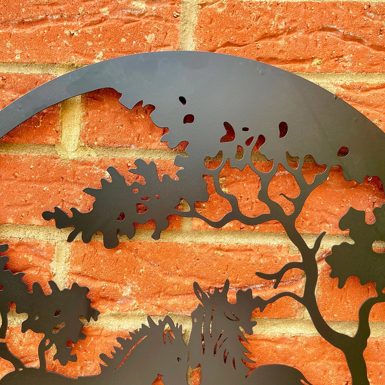 This black wall art captures a pair of horses in a stunning field scene whilst using dark coloured metals to create a striking silhouette. It can be used indoors and outdoors and is a wall mounted piece.