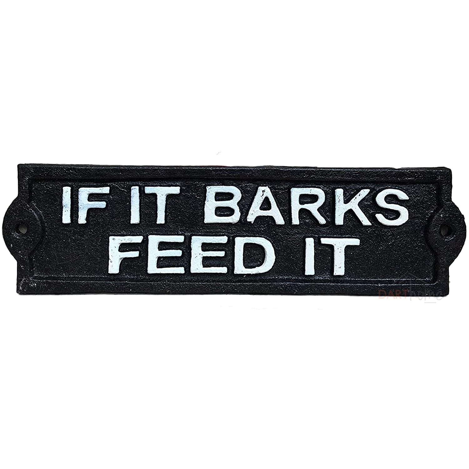 This wall mounted sign has a distressed vintage black finish. It is made from high quality cast iron, designed for outdoor use. The text reads ‘If It Barks Feed It’. It will look great in your garden on the wall, on the gate or by the front door.