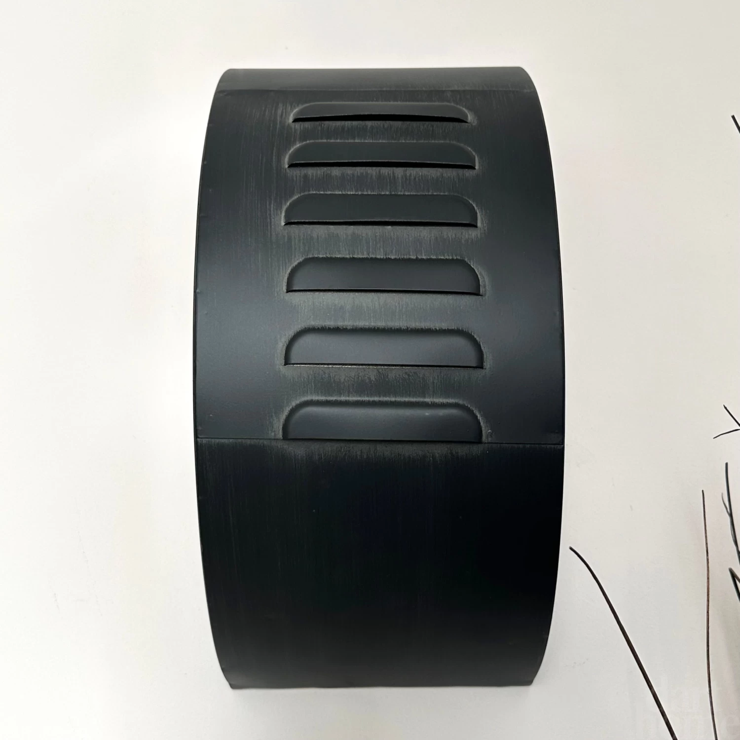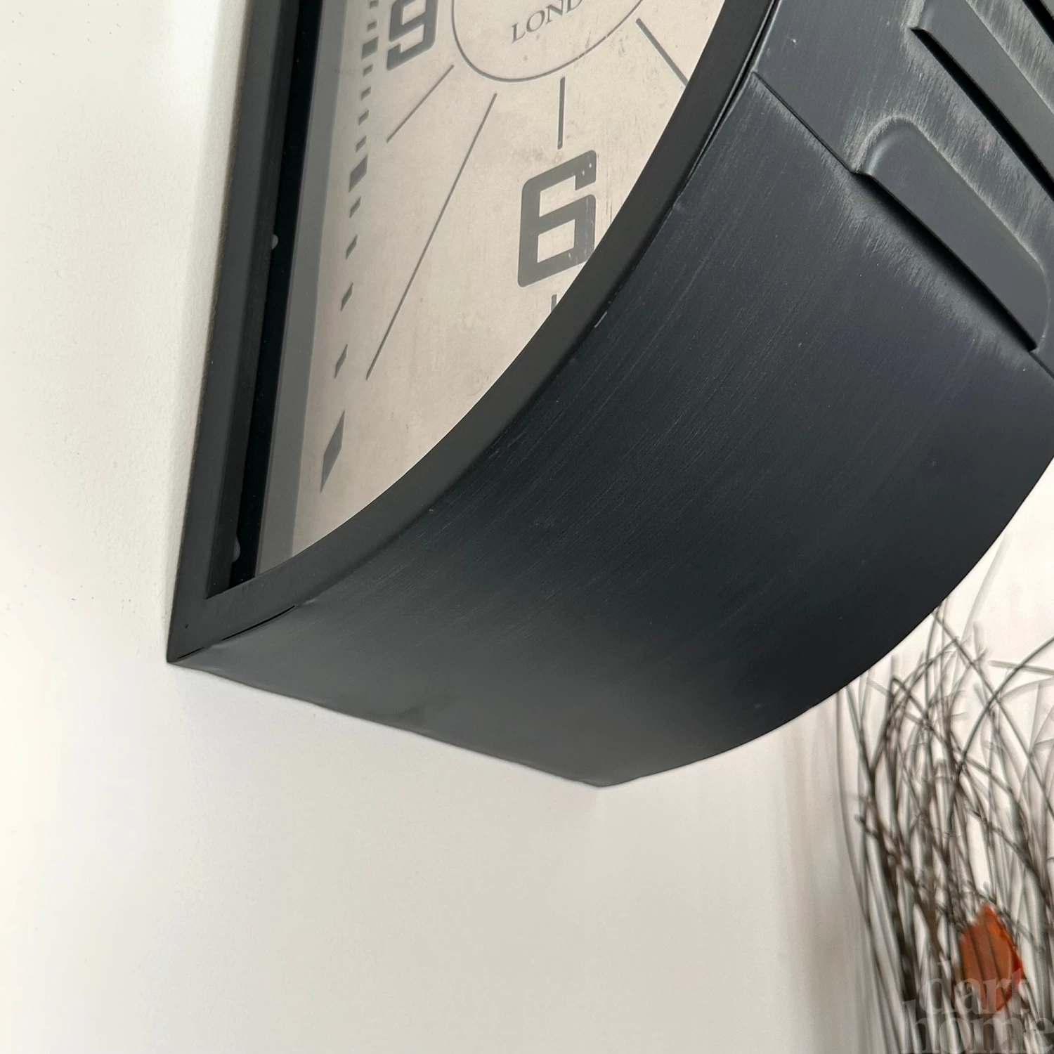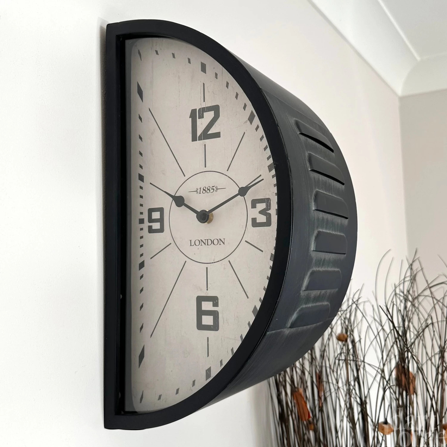 A large industrial railway wall clock features a retro double sided station design. This double sided railway clock is a battery powered piece with a quartz movement, boasting an arabic numeral display with non-numeric marks surrounding the face. AA batteries required (not supplied).