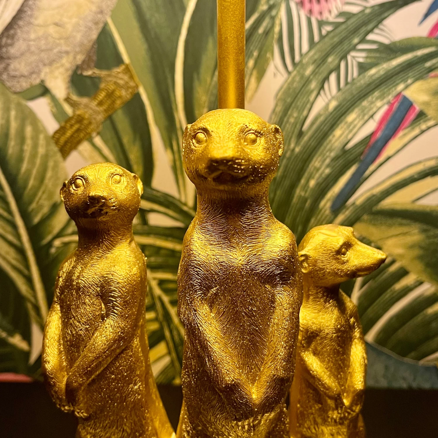 Add some eclectic colour and style into your living room with this quirky table lamp featuring this cheeky mob of standing meerkats. Also able to use a floor light, this large centrepiece with intricate detailing will be a focal point of any room. This stunning piece, finished in a warm bright textured gold features a mischievous trio of animals holding the drum black shade (bulb not included). Use a max 60W E27 light bulb to enjoy a warm, soft setting in your room.