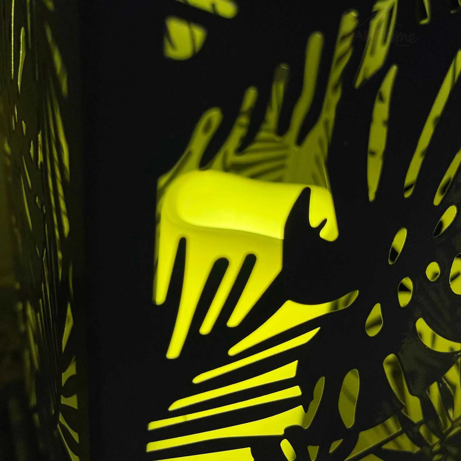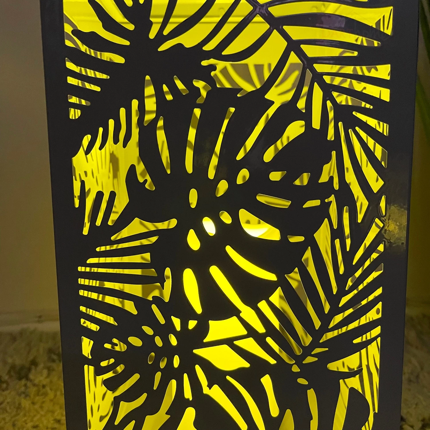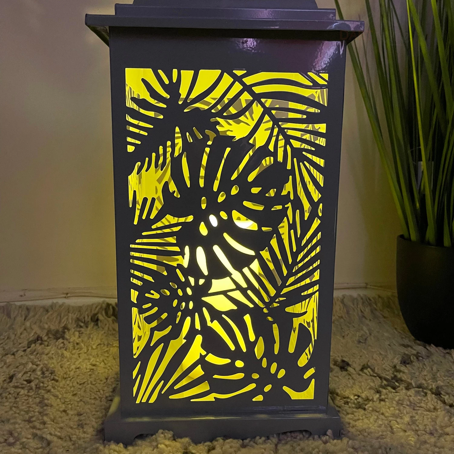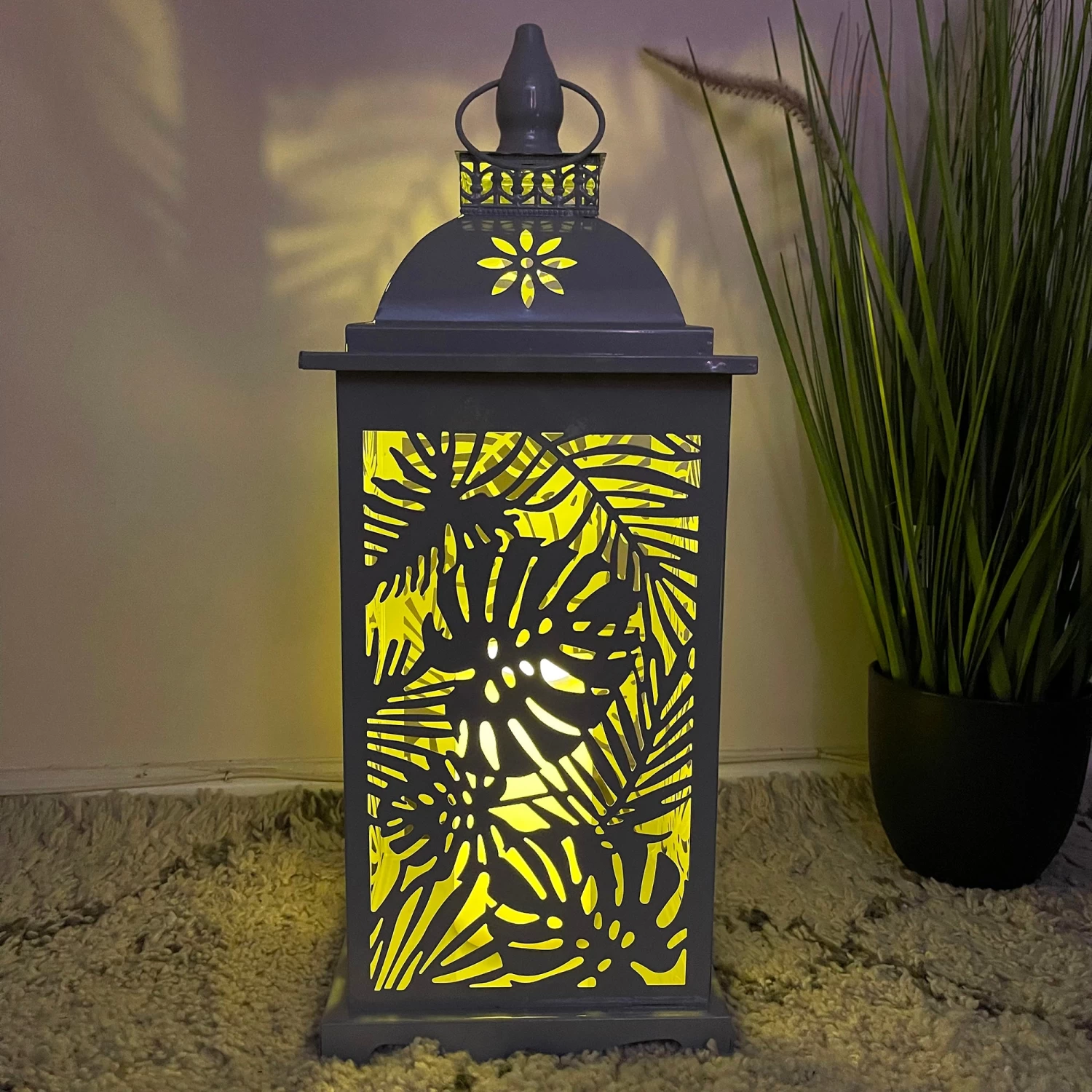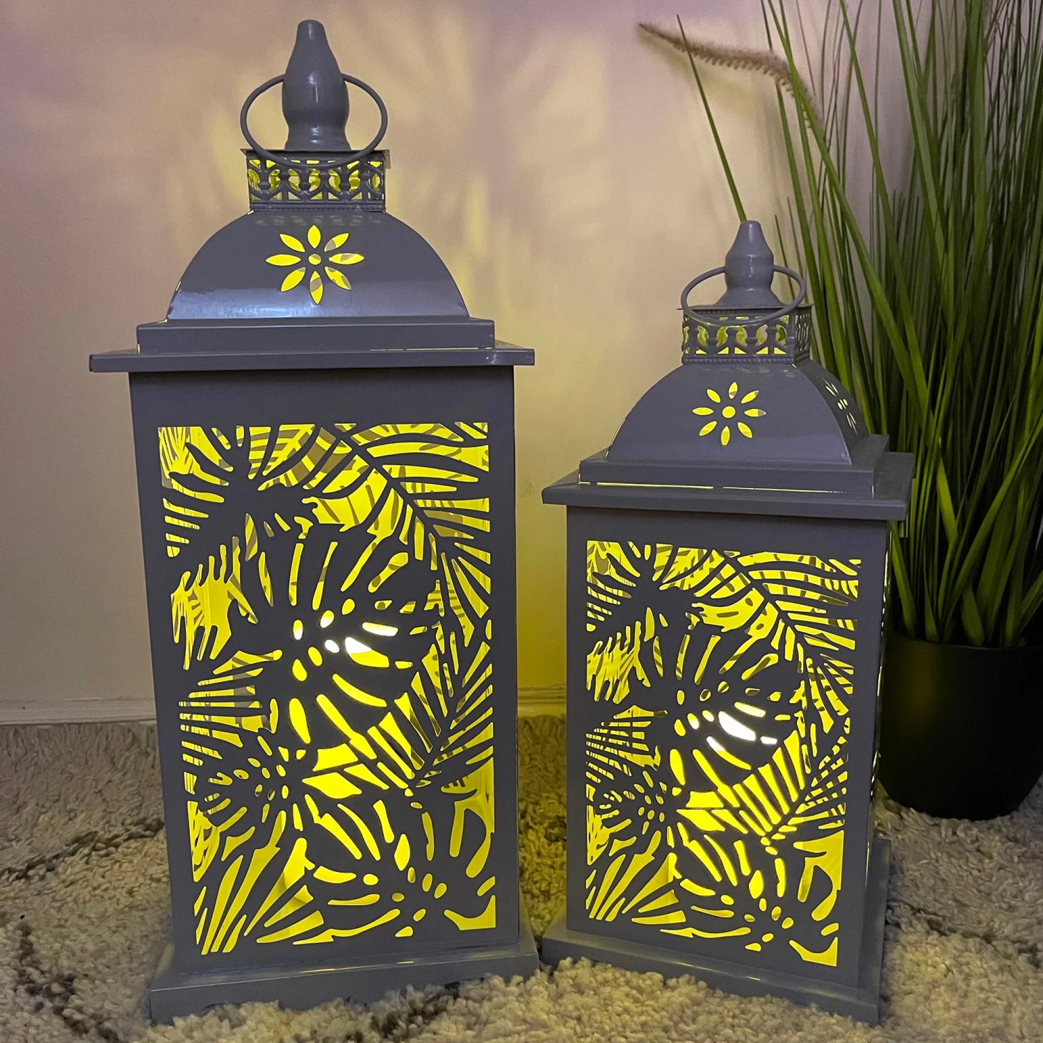 These grey lanterns display a palm leaf design and are filled with an LED candle that beam a warm white light around the room or garden. They are battery powered, requiring 3x AAA batteries (not included). They can be bought individually or as a set of 2 and are a perfect living room or garden light to gently glow in a space. Do not leave outside.