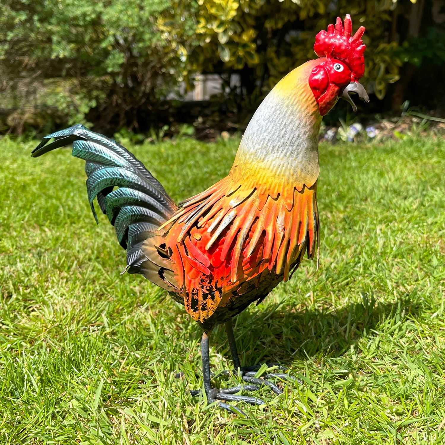 Brighten up a corner of your garden or wall with the hand-painted 26cm tall metal rooster. Freestanding, weatherproof and frost resistant farmyard bird sculpture will stand easily all year round in your outdoor space.