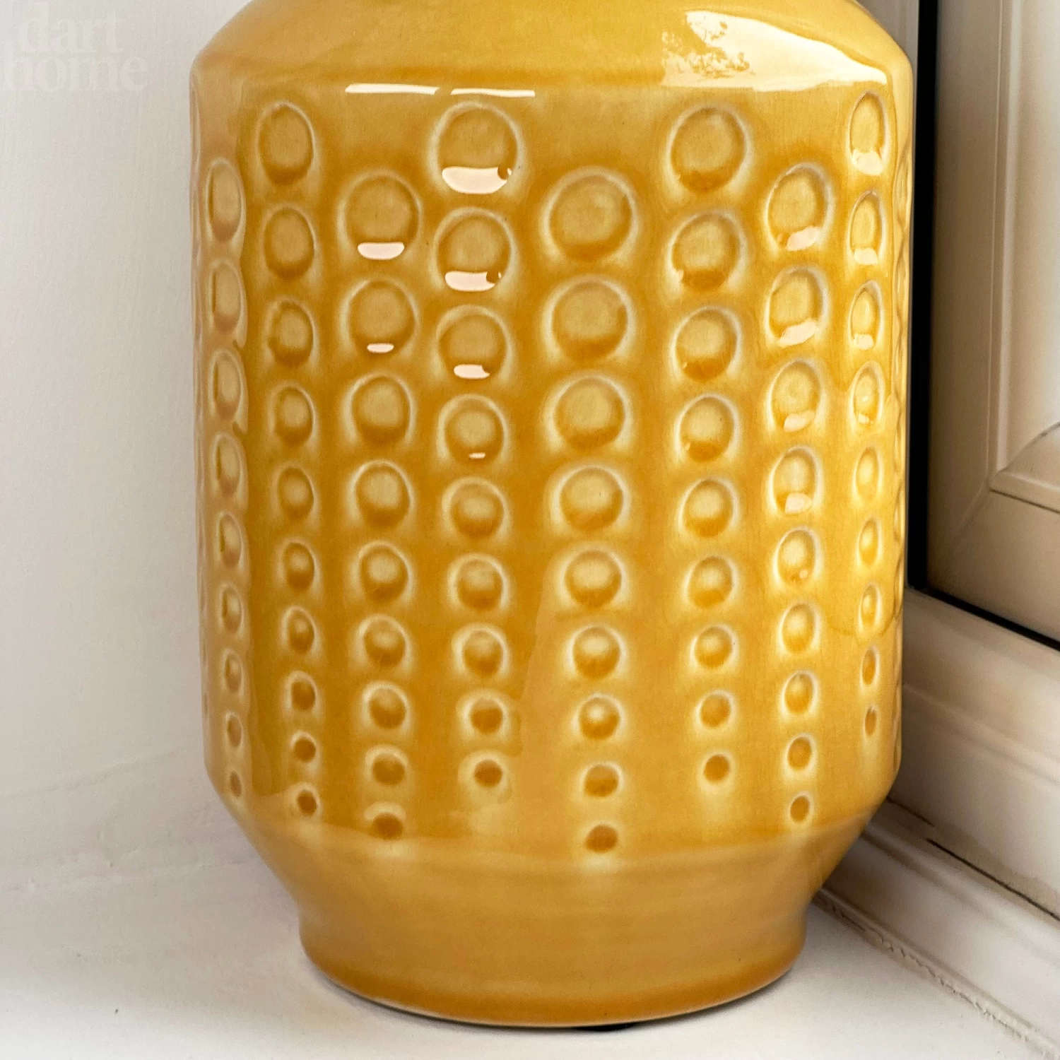 This mustard yellow crackle effect ceramic vase with a retro round indented pattern is perfect for holding floral arrangements to enhance wedding or kitchen table decoration.