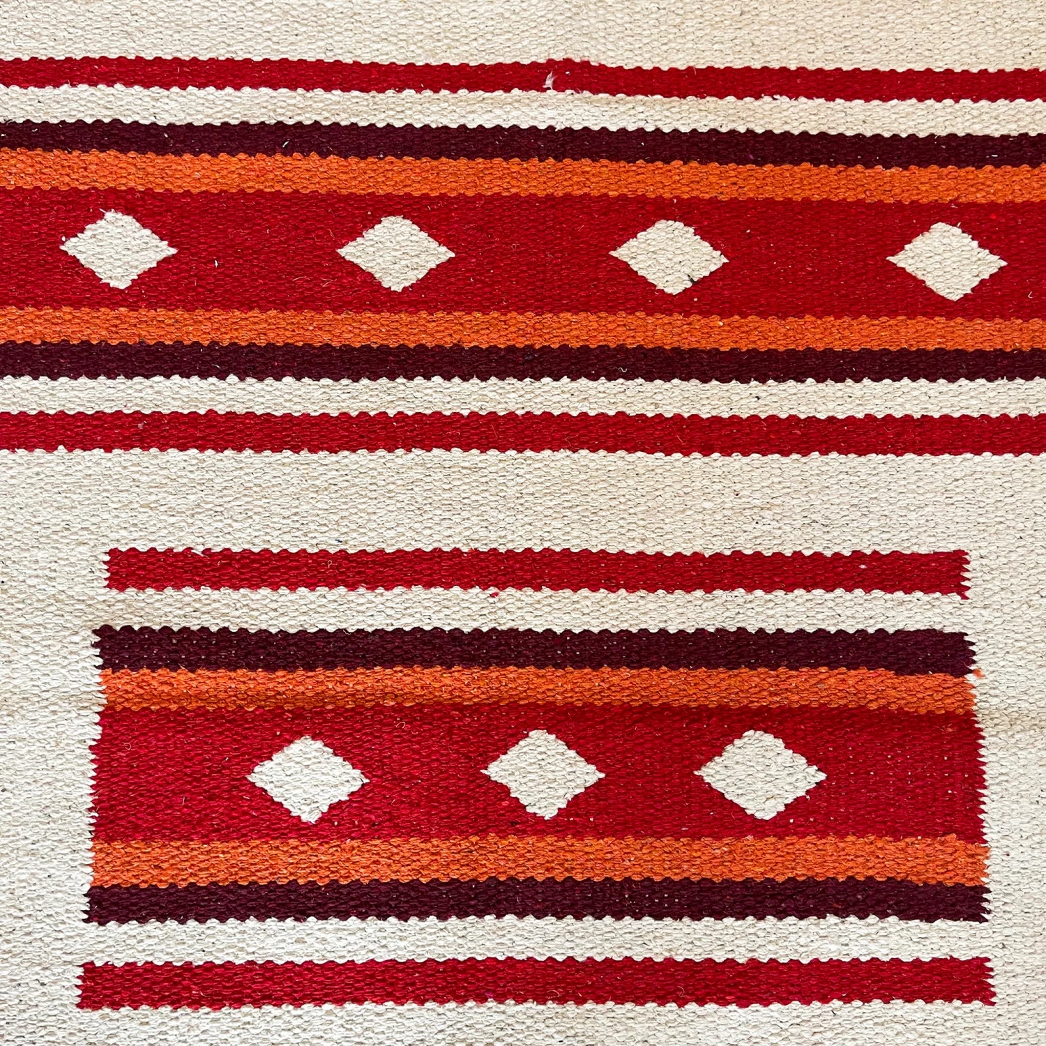 Features: Eco Friendly, Machine Washable, Red, Orange & White Pattern, Diamond Shape, Tassels, Tribal Design