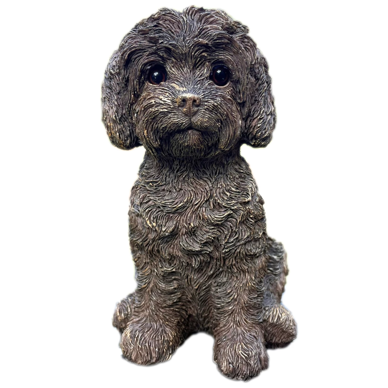 This vintage gold resin labradoodle dog statue is a beautiful piece that will look great in your home. It is the perfect gift for all those dog lovers out there and serves as a great shelf sitter. Can be used indoors and outdoors.