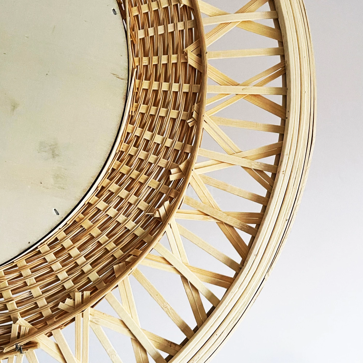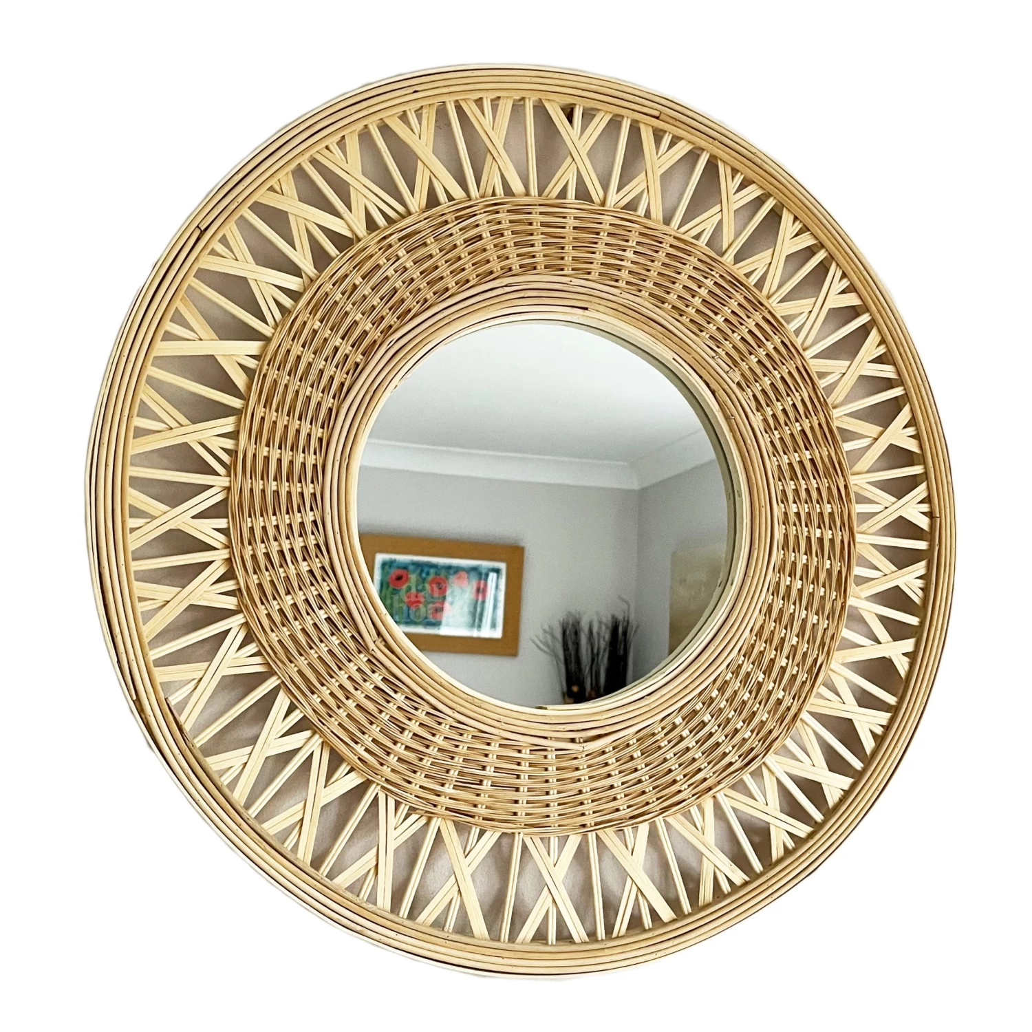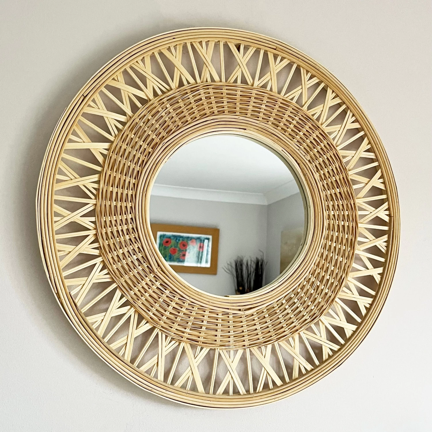 This beautiful Boho style round large mirror made from natural bamboo and will be a centrepiece of any home. It is wall mounted and lightweight, weighing 1.05kg making it a perfect lightweight hanging item for the living room or bedroom. The frame is made from bamboo wood with a glass round 24cm mirror to its centre.