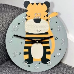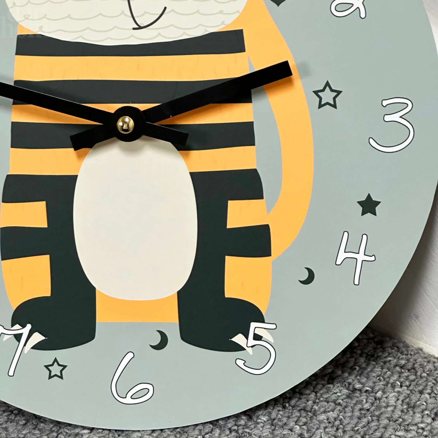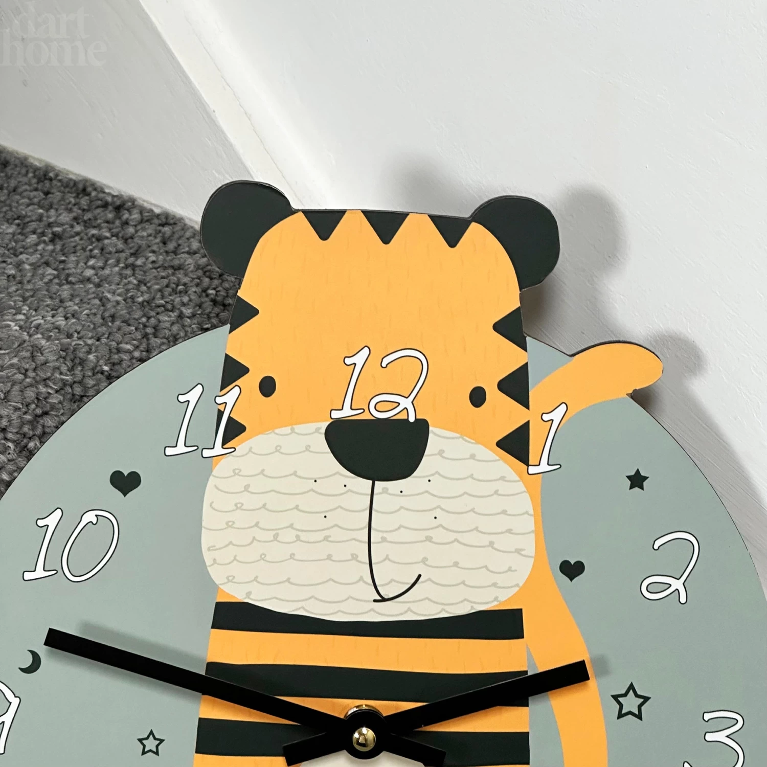 Add a fun touch to your childrens bedroom with this orange tiger wall clock in an animated style. With an eye catching grey face and black hands with a simple, easy to read 12 hour display, this round battery powered clock will be the perfect way to learn to tell the time whilst always showcasing their favourite animal.